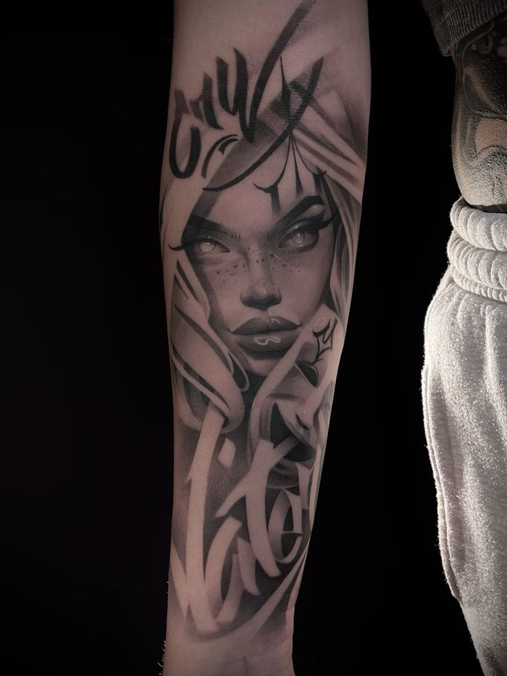 This design works best on the forearm and is a beautiful choice for women who love subtle complexity. The lettering alphabet flow gives it movement, and it’s a great example of how design drawings and portrait work can coexist without overpowering each other.