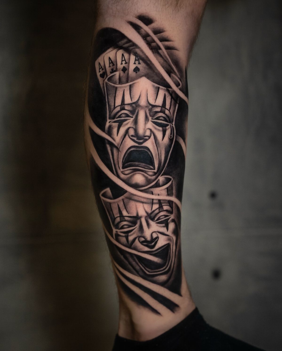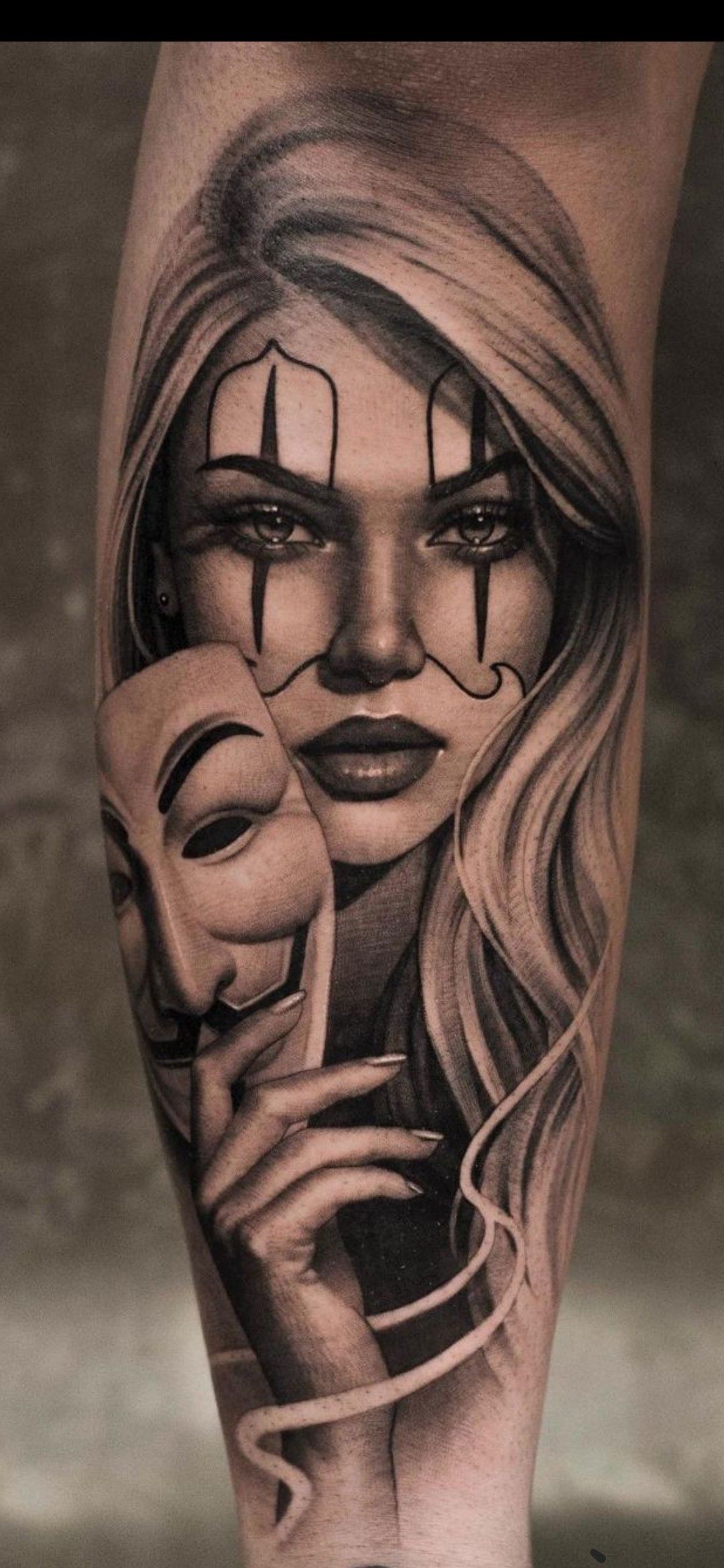 There’s something hauntingly honest about this tattoo. The classic comedy and tragedy masks feel raw, almost uncomfortable—in the best way. It speaks to emotional layers, public faces, and private truths, all wrapped in dramatic Chicano style.