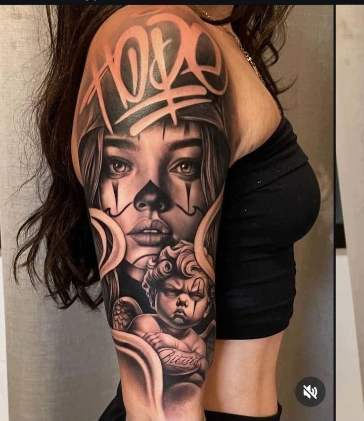 This tattoo feels deeply protective and emotional. The childlike Angel figure paired with the strong female portrait gives off serious guardian energy—love, loss, and strength wrapped together.