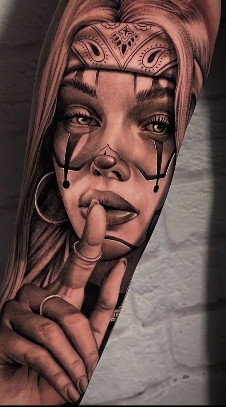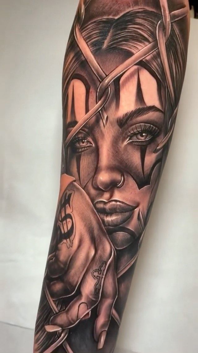 This tattoo radiates attitude. The braided hair, bold expression, and intense gaze feel unapologetic and powerful. It’s the kind of piece that commands attention without needing color or excess detail.