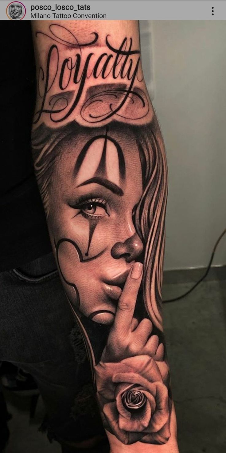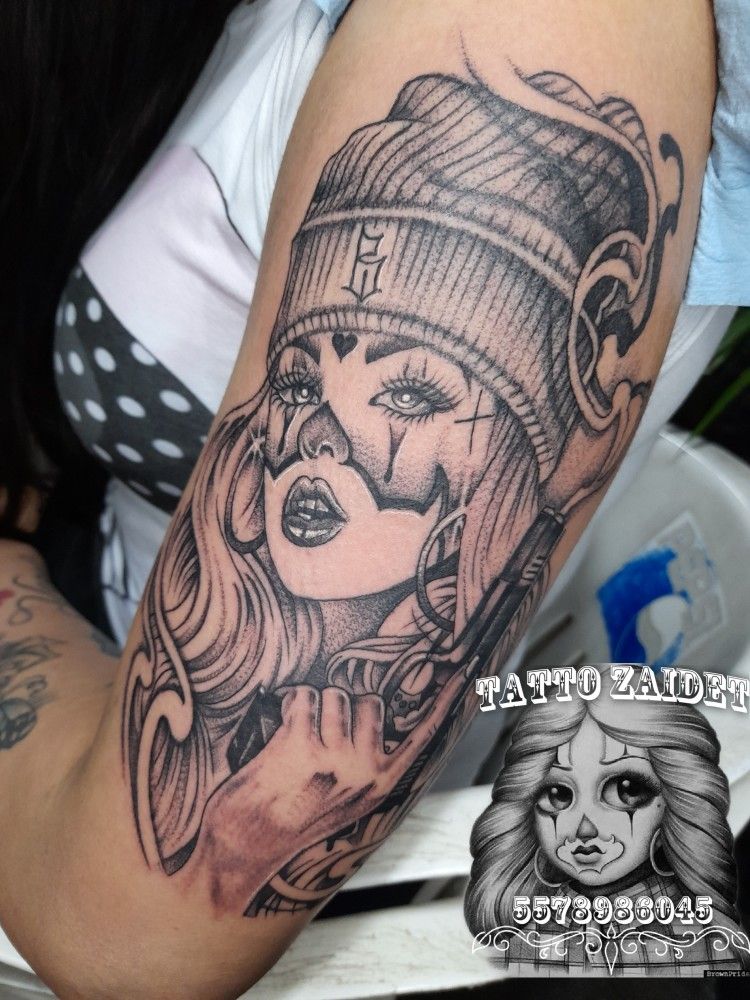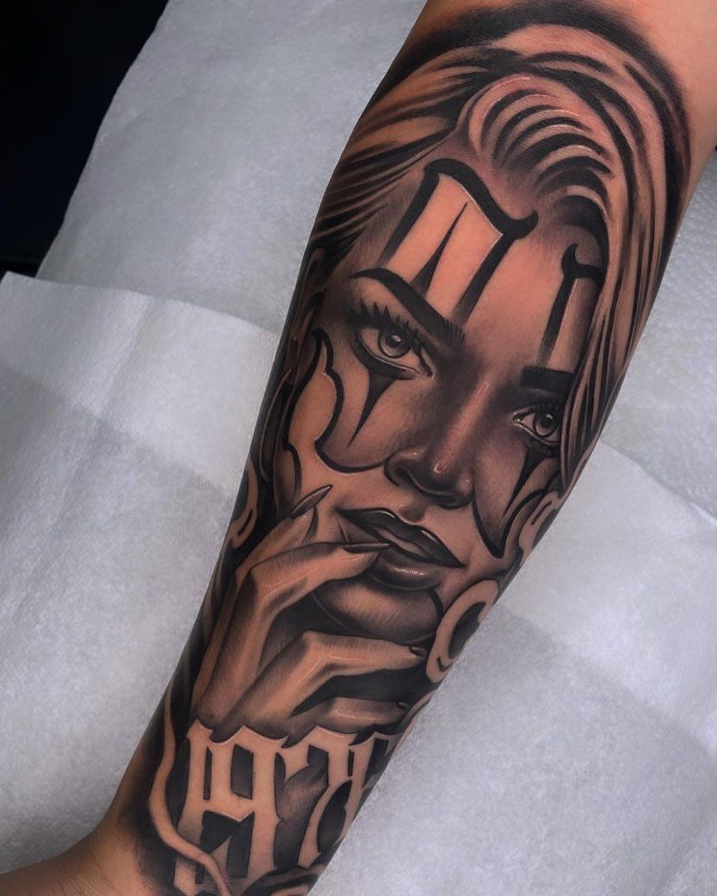This tattoo blends raw attitude with soft femininity in a way that feels fearless. The expressive face and strong lettering immediately pull you in—it’s bold, dramatic, and a little rebellious. There’s an oldies-inspired vibe here, like classic Chicano culture meeting modern confidence, and honestly, it makes a statement without asking permission.