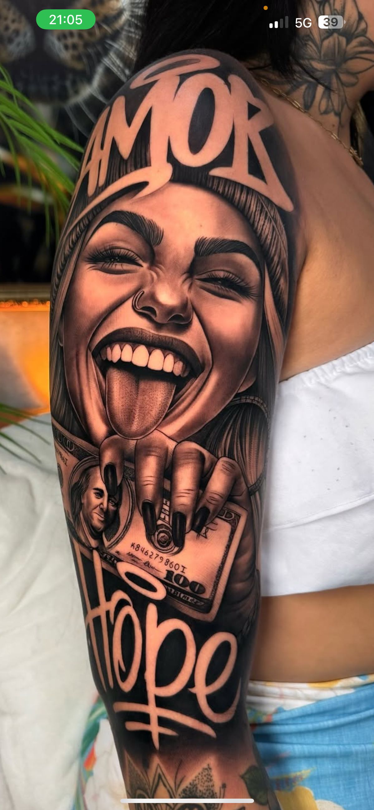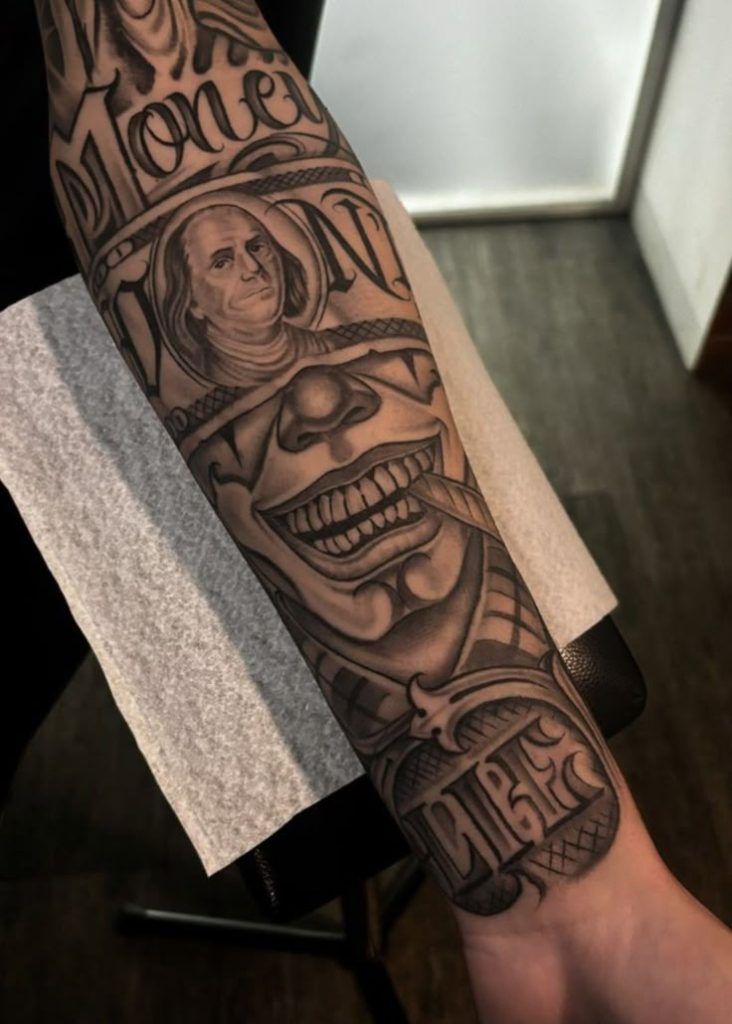 This tattoo is pure attitude—playful, bold, and impossible to ignore. The laughter, cash, and oversized lettering create a high-energy vibe that feels confident and rebellious, with a touch of humor.