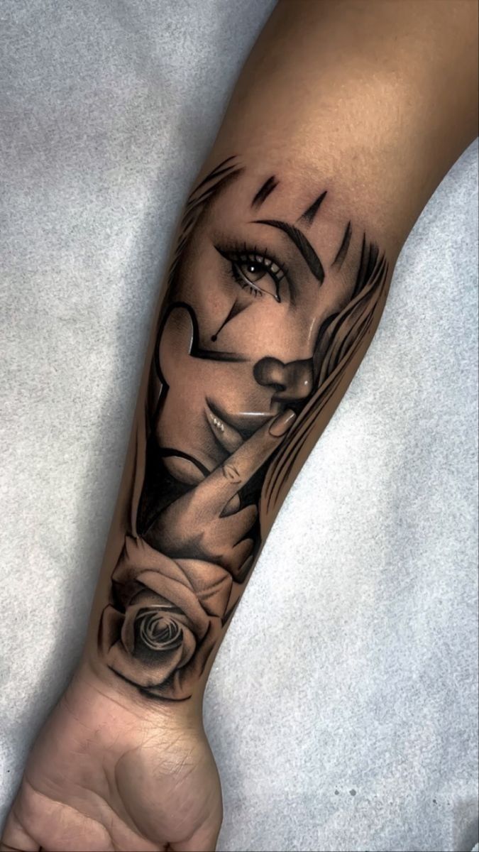 This design shines on the arm or forearm and works especially well for women or men who want expressive design ideas without overcrowding. It’s a great option if you’re drawn to Arte-inspired portraits and want something that flows naturally into a sleeve. The shading style also makes it stencil-friendly for future additions.