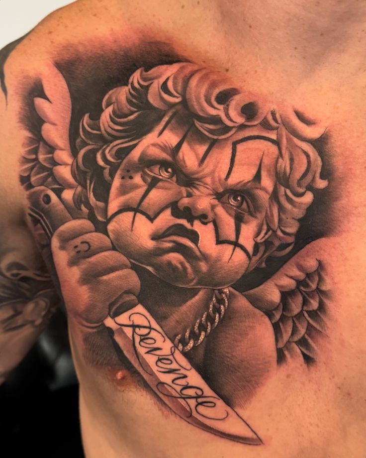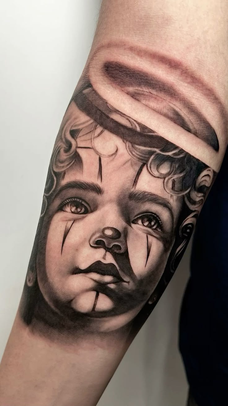 This piece is emotionally powerful and slightly unsettling—in a way that really stays with you. The cherub-like figure combined with the blade and lettering creates a story about innocence, protection, and loss. It feels raw and deeply personal, like a tribute wrapped in strength rather than sadness.