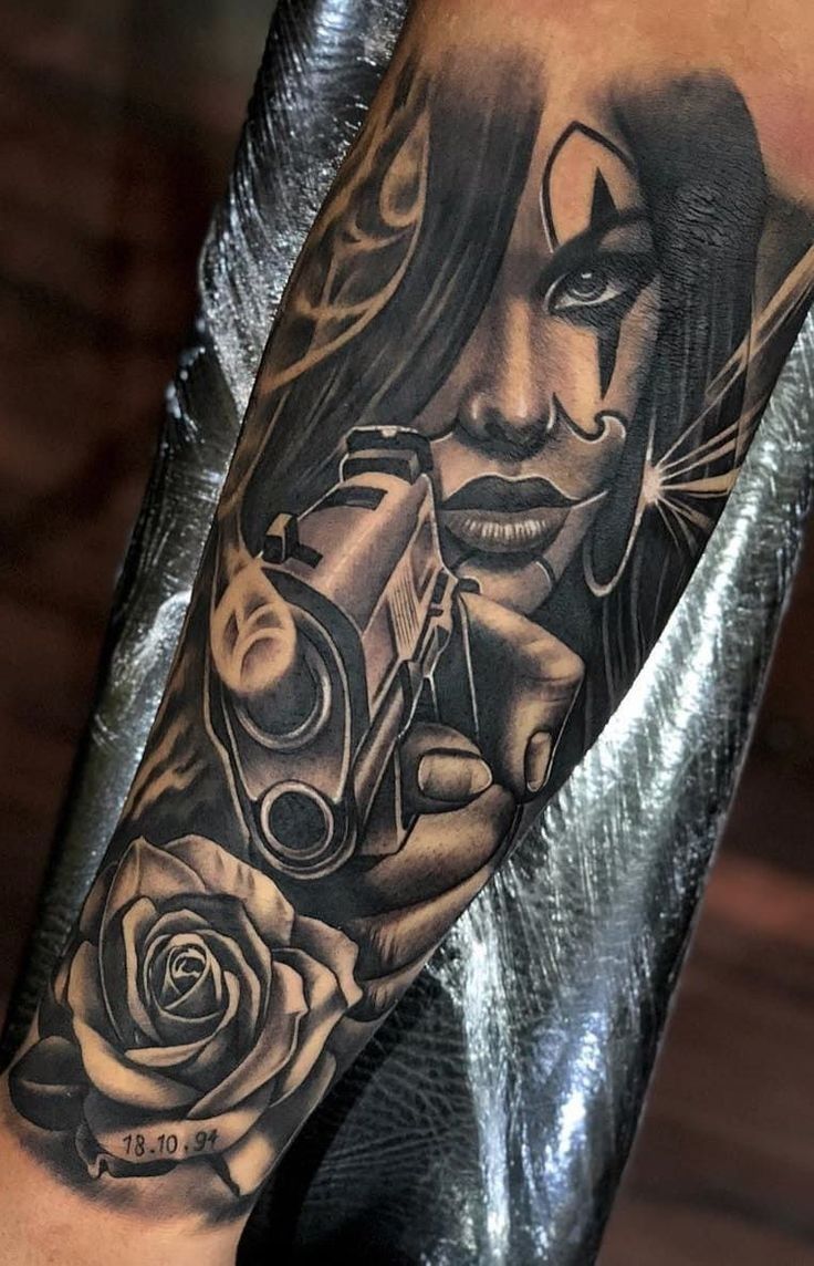 This piece feels fearless in the most unapologetic way. The intense stare, the steady hand, and the soft rose below create a striking emotional contrast—beauty and danger sharing the same space. It gives off serious main-character energy, like a woman who’s done being underestimated and isn’t afraid to protect what matters to her.
