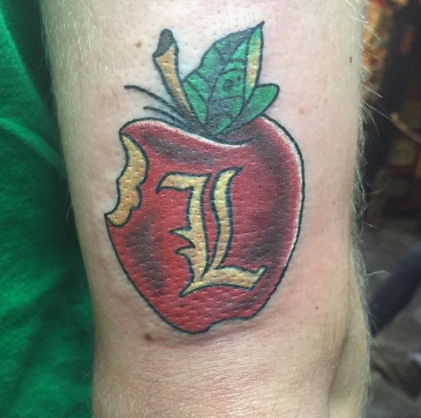 This design feels quiet but loaded, like a secret shared between worlds. Two hands reaching for a single apple instantly tap into temptation, fate, and consequence—all themes that make Death Note tattoo ideas so compelling. It’s subtle, poetic, and emotionally charged without needing a single face or dramatic expression. The red apple becomes the heartbeat of the piece, drawing the eye in and making you pause.