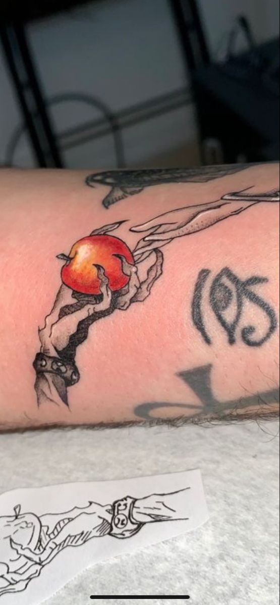 This tattoo feels intimate and symbolic, like a quiet moment frozen in time. The skeletal hand offering the apple instantly brings up themes of choice, curiosity, and consequence. It’s understated but emotionally rich, the kind of design that reveals more meaning the longer you sit with it.