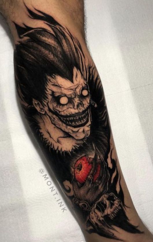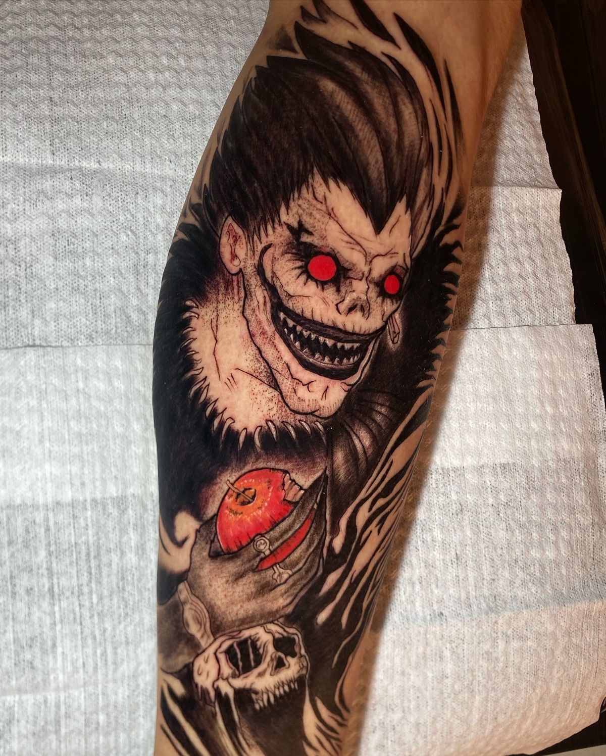 This tattoo is perfect for someone who loves high-impact visuals and isn’t afraid of attention. It works beautifully on the calf or forearm and stands out as one of the most dynamic Death Note tattoo ideas in the entire collection. It’s daring, expressive, and unforgettable.