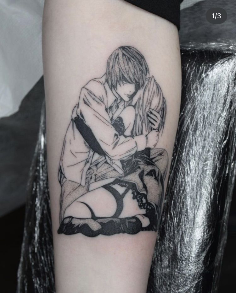 This piece is tender, emotional, and surprisingly soft for a Death Note tattoo. The way the figures hold each other feels protective and intimate, capturing the vulnerability behind the chaos of the story. It’s the kind of tattoo that feels personal, almost like a private memory rather than a fandom reference.