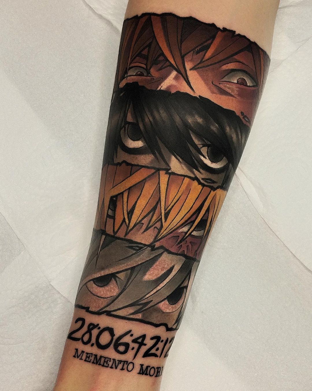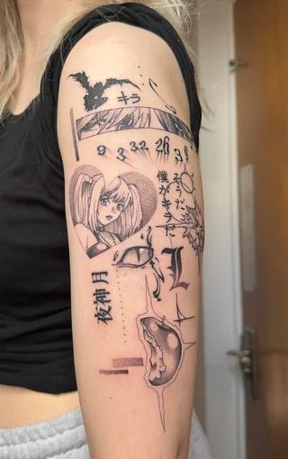 This tattoo feels like flipping through the pages of the manga itself. Fragmented imagery, symbols, and characters blend together into a layered narrative that rewards closer inspection. It’s artistic, thoughtful, and deeply immersive.