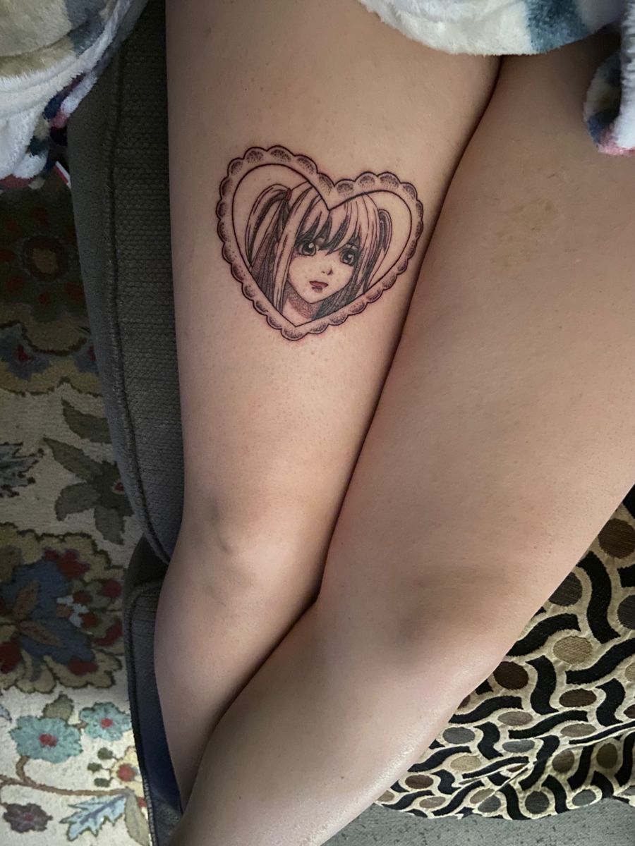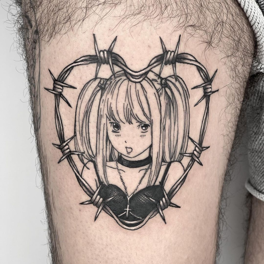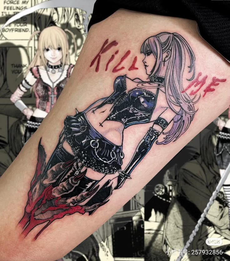 This tattoo doesn’t hold back—it’s dramatic, feminine, rebellious, and unapologetically bold. Misa’s confident posture and intense styling give the piece a fashion-editorial feel, almost like a dark manga spread frozen on skin. It radiates attitude and self-expression, perfect for someone who connects deeply with her character.