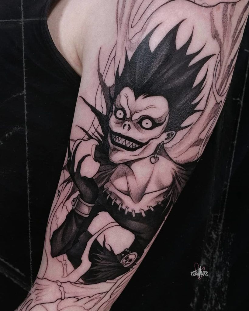 This tattoo suits someone who loves fashion-forward ink with attitude. It works especially well on the calf or forearm, where the vertical framing enhances the silhouette. If you want your Death Note tattoo ideas to feel stylish and a little seductive, this one delivers.