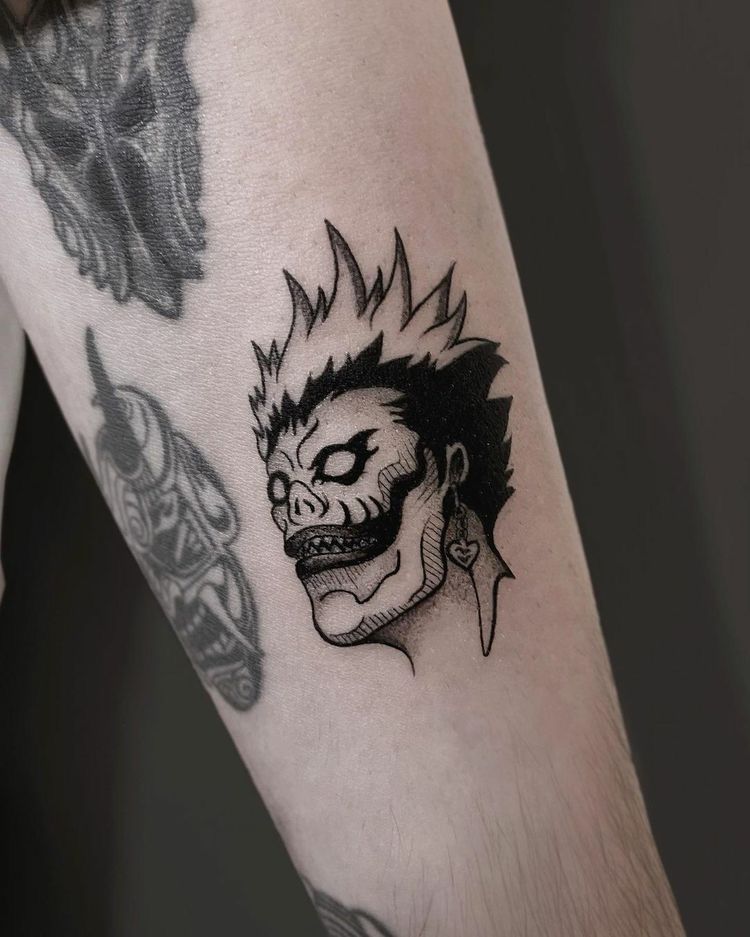 There’s something refreshingly restrained about this Ryuk design. No chaos, no excess—just his unmistakable silhouette and expression rendered in clean black lines. It feels confident and intentional, like you don’t need to explain the reference to anyone who truly gets it. This kind of tattoo whispers rather than shouts.