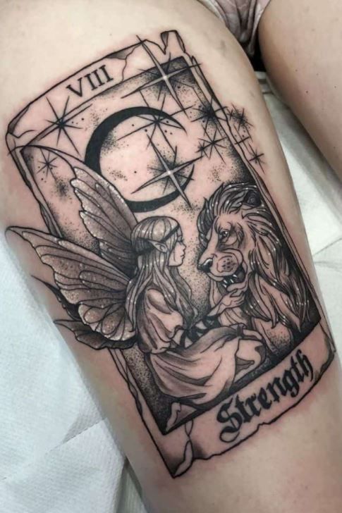 Because of its detailed composition, this design shines on the thigh or upper leg, where the storytelling elements have room to breathe. Black and grey shading keeps it timeless, while the symbolism makes it deeply personal. It’s an ideal choice for women who want tattoos that reflect resilience and self-trust.