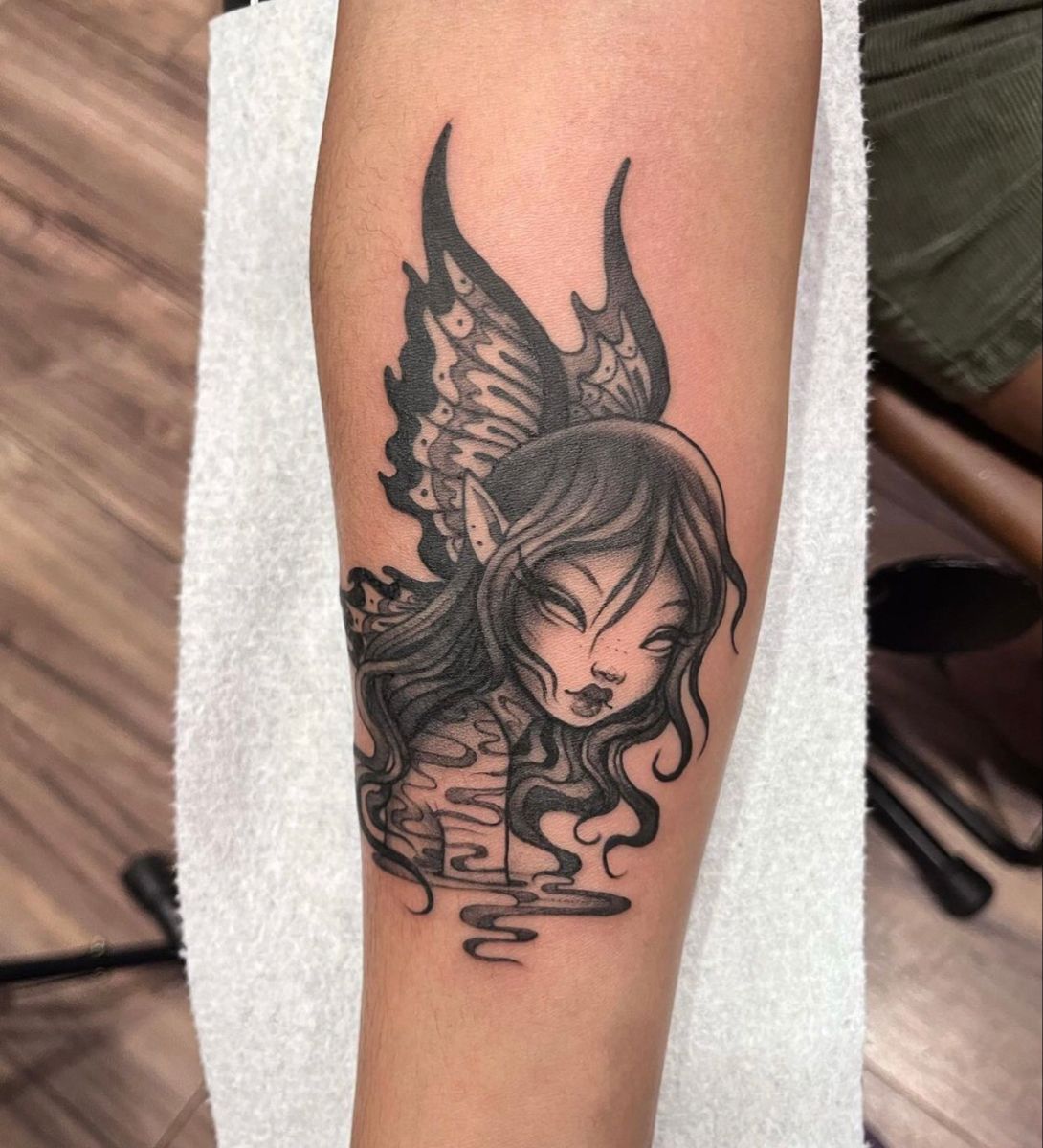 This design works best on the arm, where the portrait-style composition can really stand out. The darker tones make it a striking choice for those drawn to dark fairy designs that feel powerful rather than sweet. It’s ideal if you want a tattoo that reflects confidence, individuality, and edge.