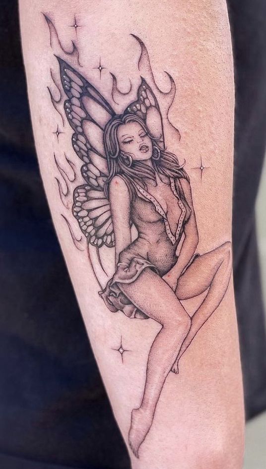 This fairy carries drama in the best possible way. The flame-like wings and sultry expression lean into a dark, Gothic fantasy that feels bold yet refined. She’s not hiding in the background—she owns her space. There’s a classic allure here, almost cinematic, that makes this one of those fairy tattoo ideas you’d expect to see in a storybook written for adults.