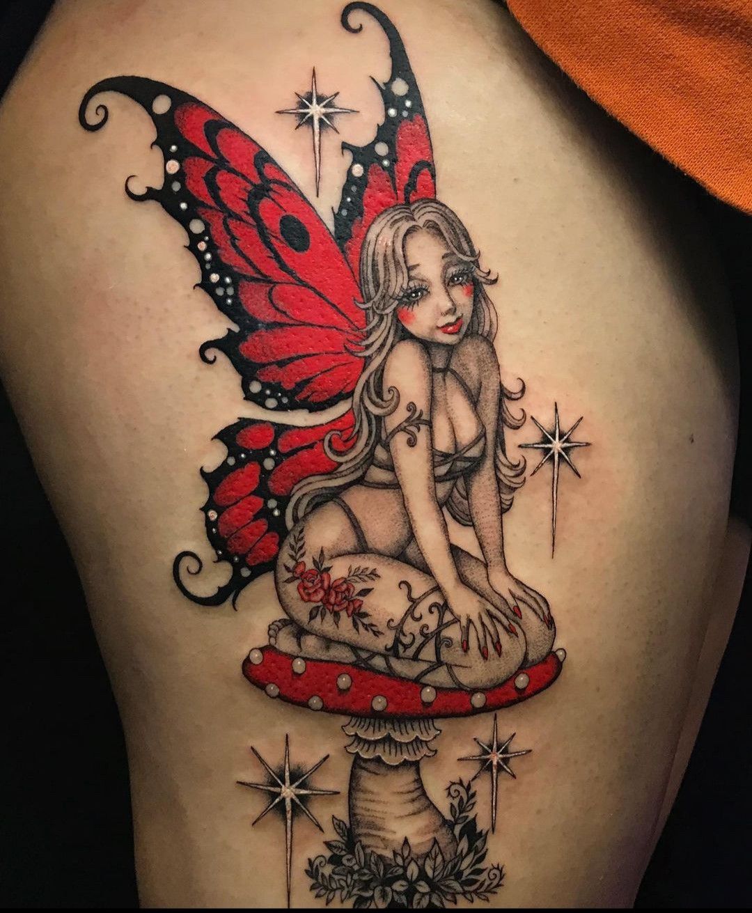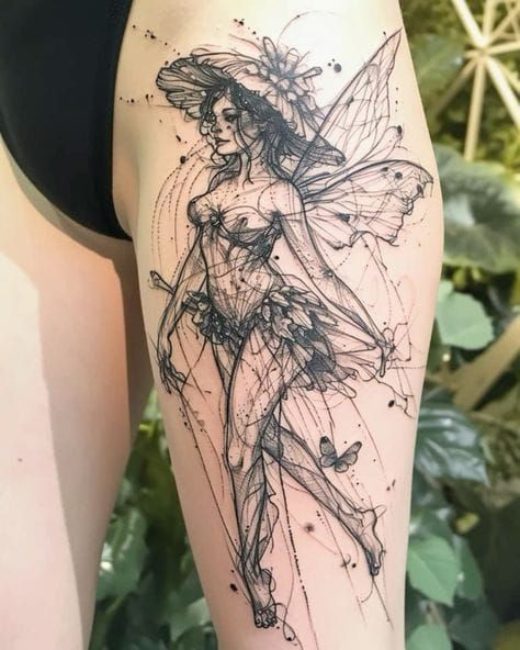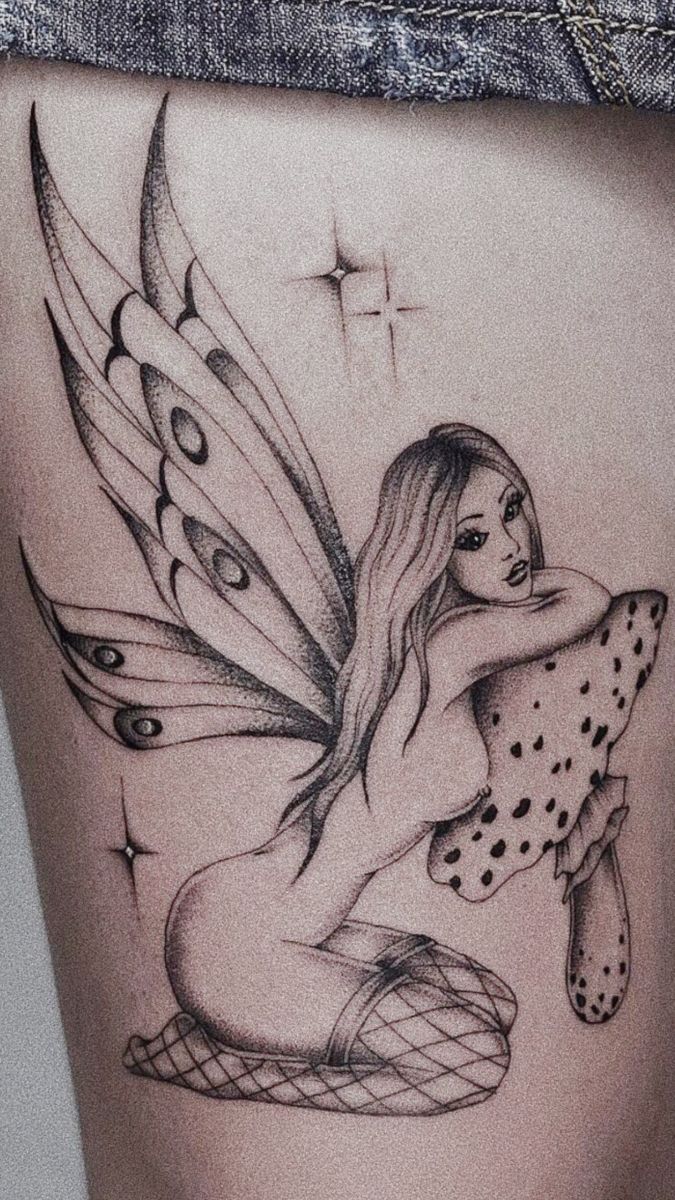 This piece works best for women’s thigh or upper leg placement, where the details can shine. It’s a great choice if you love storytelling tattoos that feel alive and layered. Among fairy tattoo ideas, this one is pure escapism.