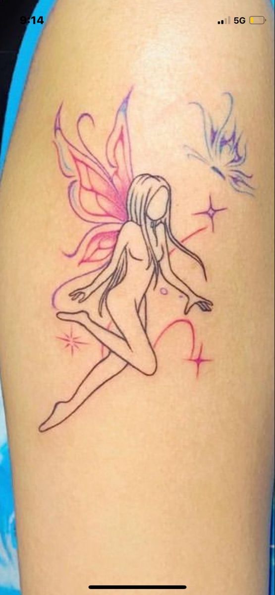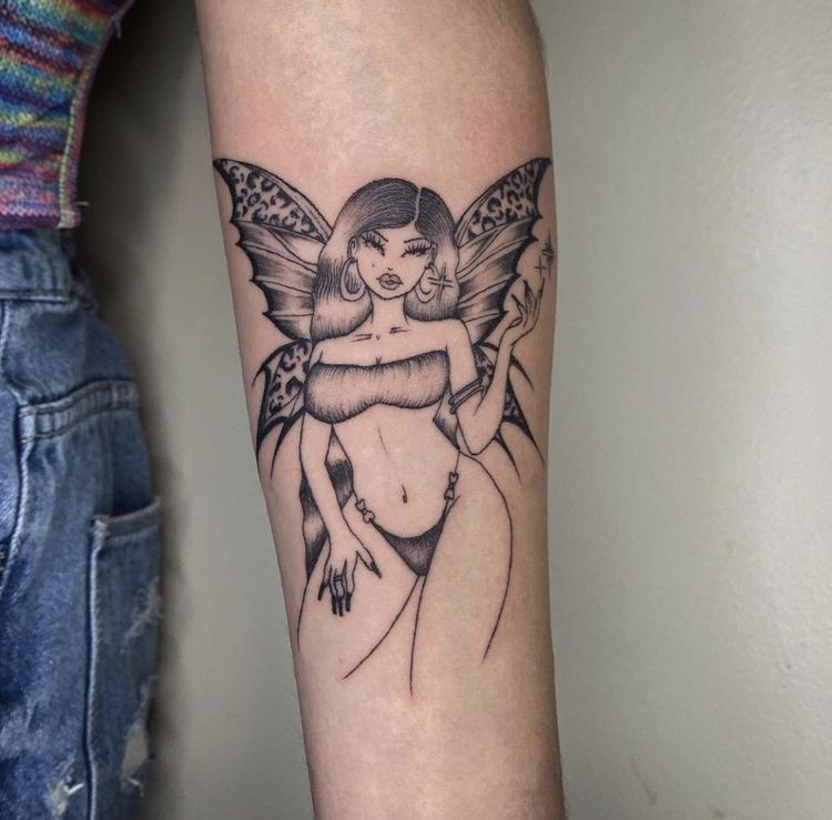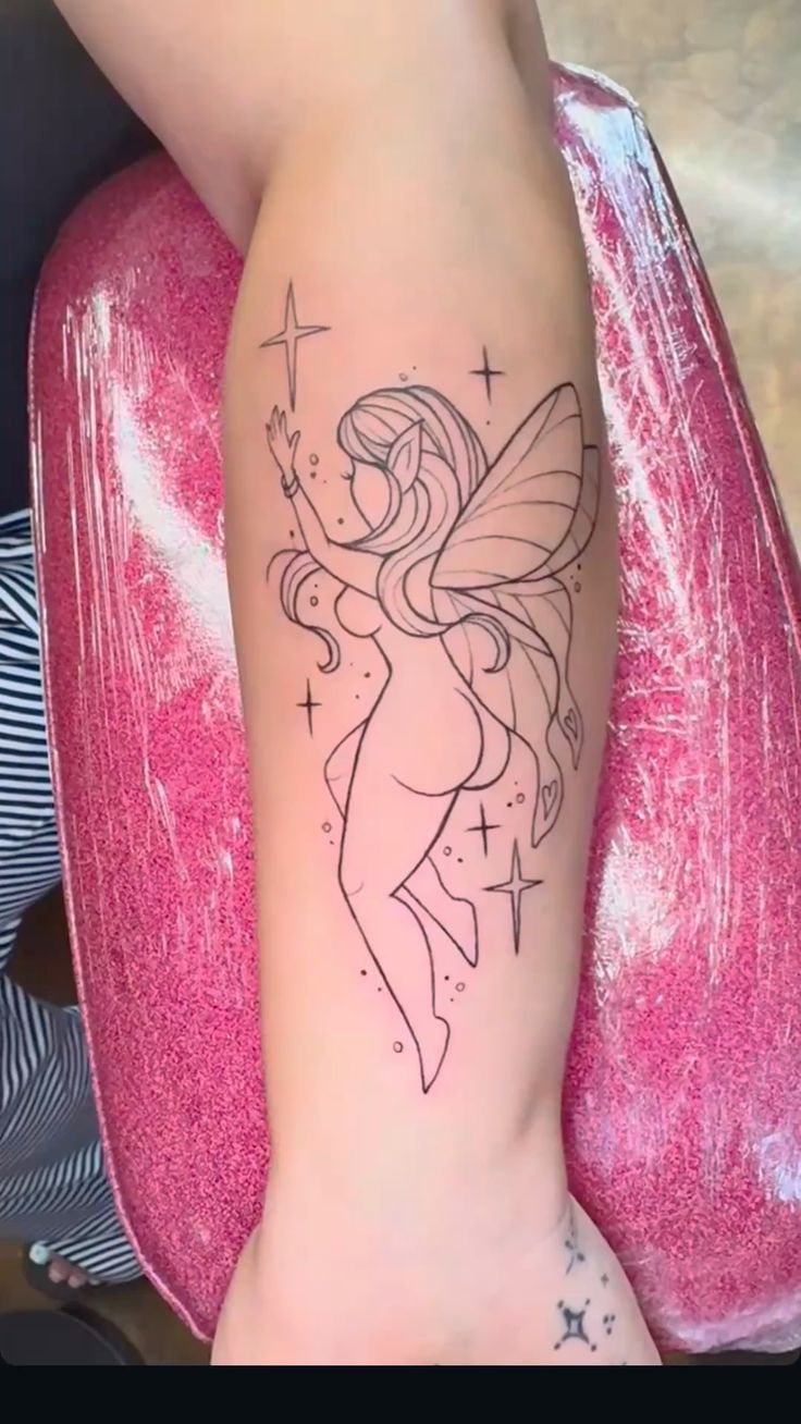 This tattoo is ideal for the arm and suits those who love fine-line designs that feel light and contemporary. It pairs effortlessly with any style, from casual to dressed-up. If you want fairy tattoo ideas that feel fresh and unfussy, this one is a standout.