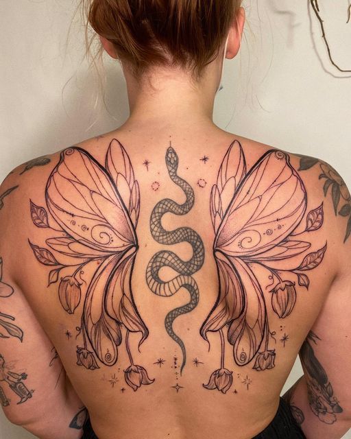 This design is perfect for women’s back placement and works best when you’re ready to fully commit to a large, meaningful piece. Fine line details ensure elegance despite the size. Among fairy tattoo ideas, this one is for those ready to step fully into their story.