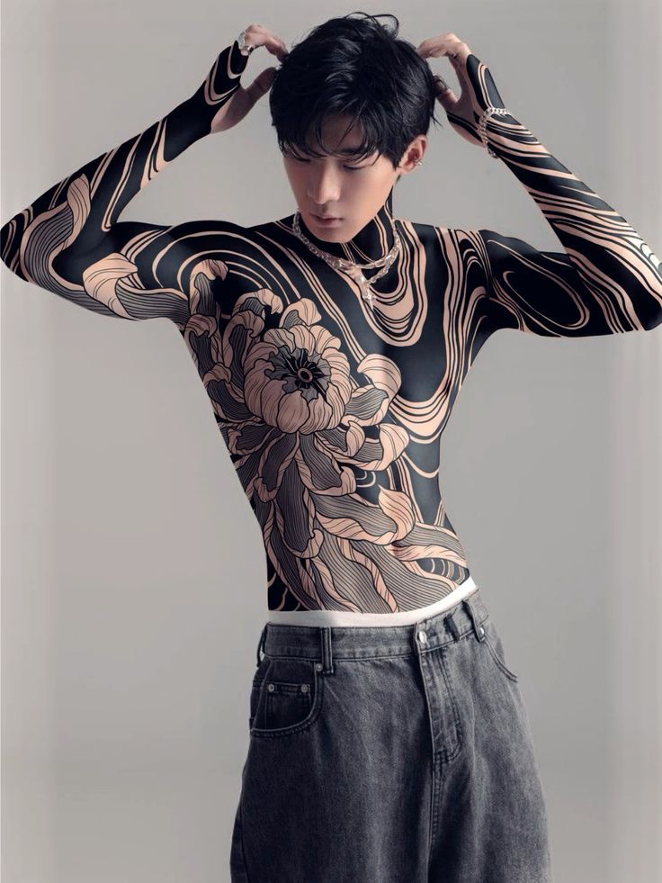 This look feels like confidence wrapped in lace. Dark florals flow across the body with a softness that contrasts beautifully against their bold presence. It’s feminine, strong, and quietly commanding.