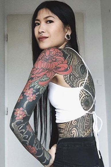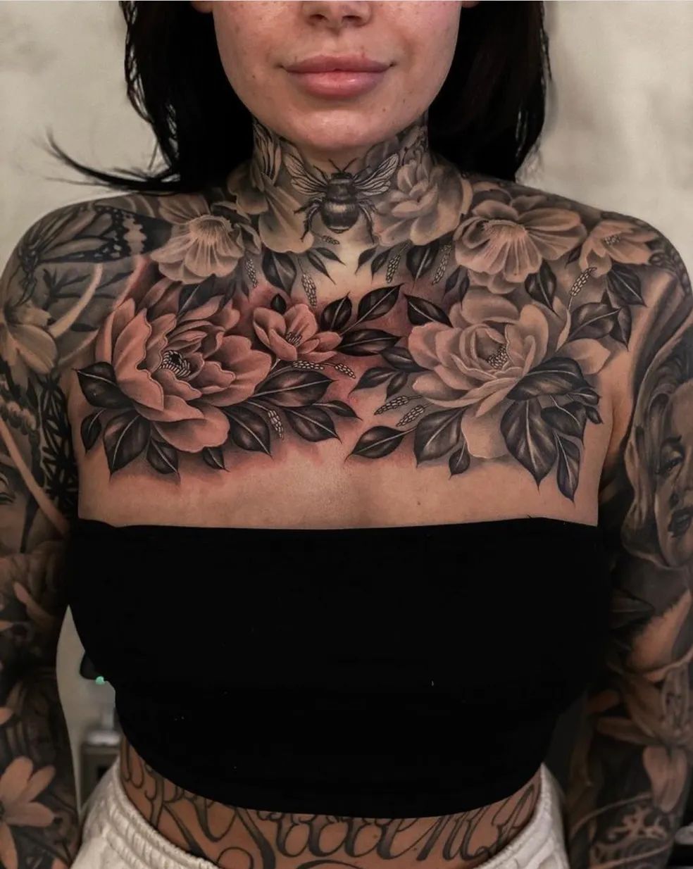 This full-body tattoo idea feels quietly powerful, like elegance that doesn’t need an introduction. The floral elements bloom across the chest and rise toward the neck with a softness that feels intimate and intentional. It’s romantic without being delicate, grounded yet undeniably expressive—perfect for women who want their tattoos to feel like part of their natural silhouette.