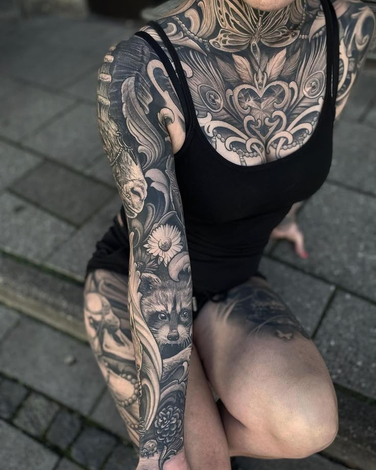 There’s a primal strength in animal imagery—especially when done in soft black and grey. This full-body look feels protective, grounded, and deeply personal, like wearing your instincts on your skin.