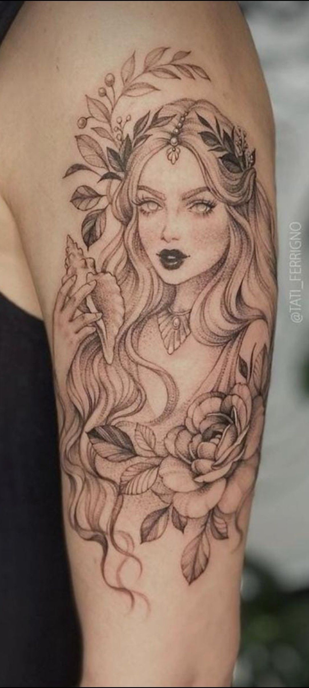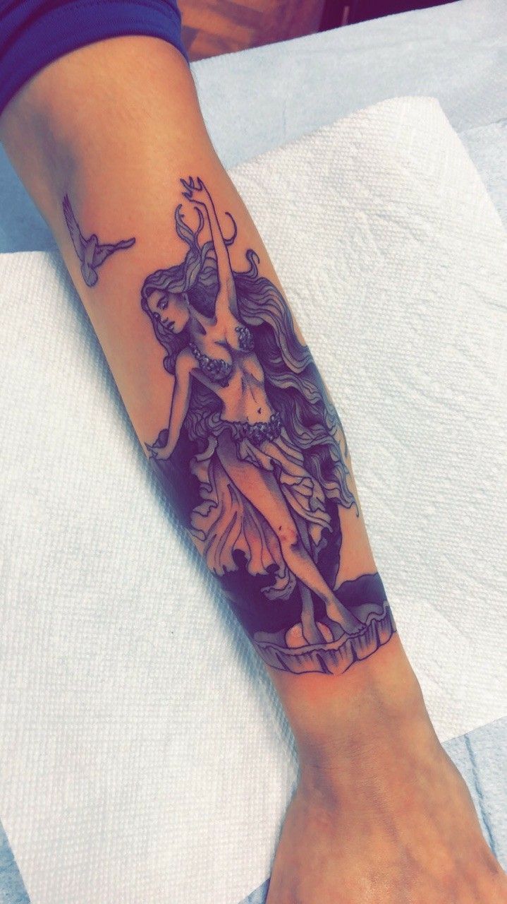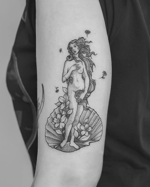 Okay, this is the kind of Aphrodite tattoo that makes people lean in closer. The conch shell feels intimate—like a secret you keep for yourself—while her face is bold, almost editorial. It’s romantic, but not fragile. More like, “I know exactly what I bring to the table.”