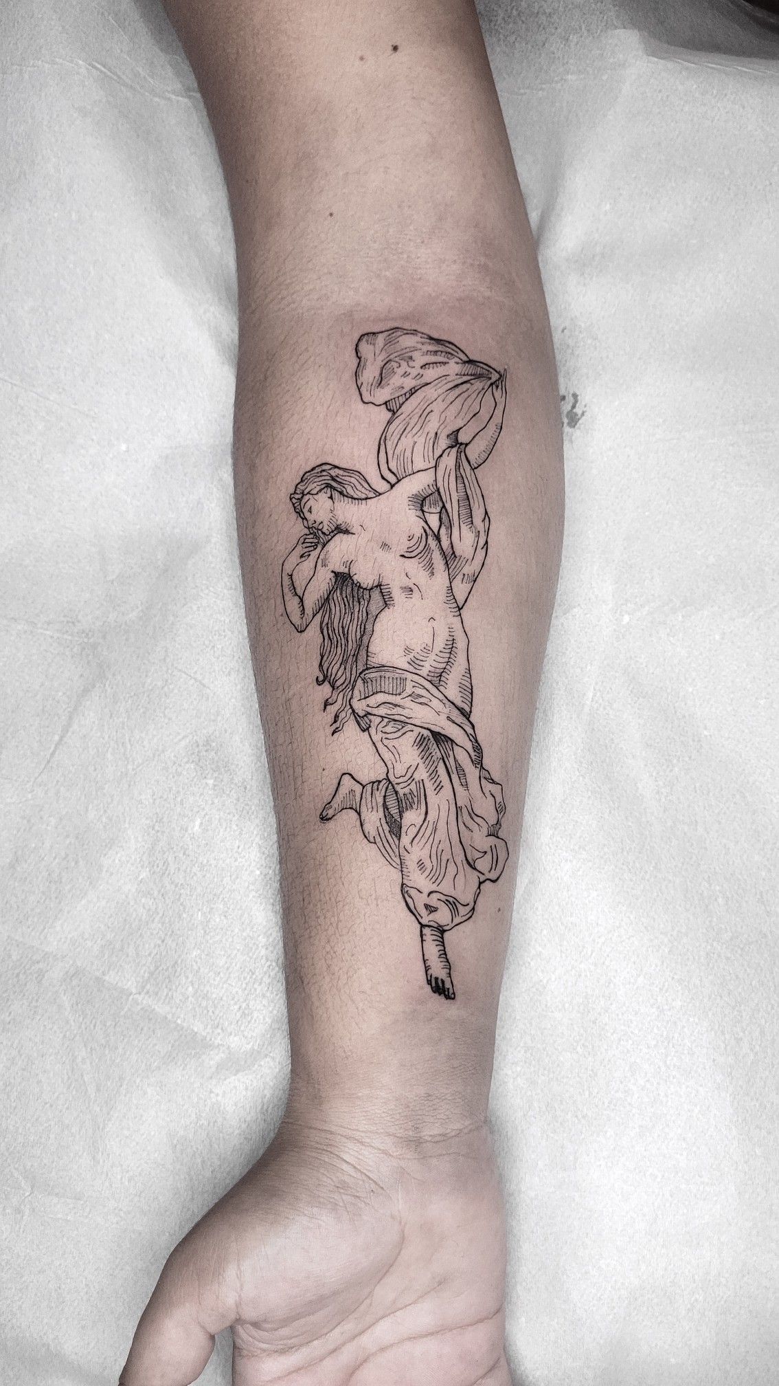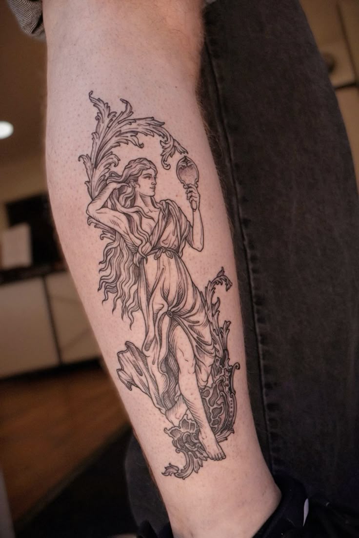 Who it’s for: anyone who loves a clean Statue-inspired design and wants something elegant on the forearm or calf. This kind of linework looks best on smoother skin areas where the folds can stay sharp. Keep the shading light and let the negative space do the heavy lifting—simple lines and a strong silhouette are exactly why this reads so chic.