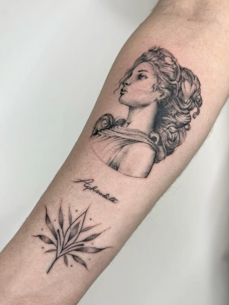 This one feels like you borrowed beauty from a museum and made it personal. The face has that serene, timeless expression you see in old sculptures—calm, composed, and quietly powerful. It’s the kind of Aphrodite tattoo that doesn’t scream for attention but somehow always gets it.