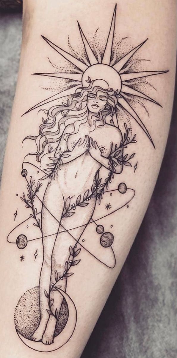 If you’re choosing between a busier goddess scene and something more wearable, this is the sweet spot. It works beautifully as a medium-to-large arm placement because the flowing hair and branches need room to look graceful. Keep the black shading light in the drapery and deepen it slightly in the hair for contrast. It’s one of those design ideas that makes you feel instantly more polished—like jewelry you never take off.