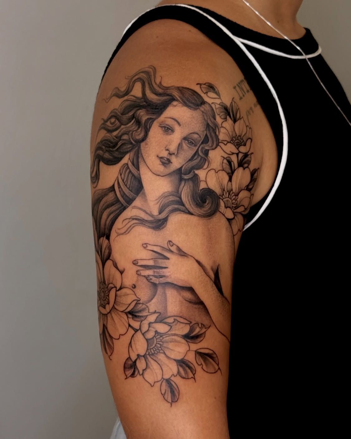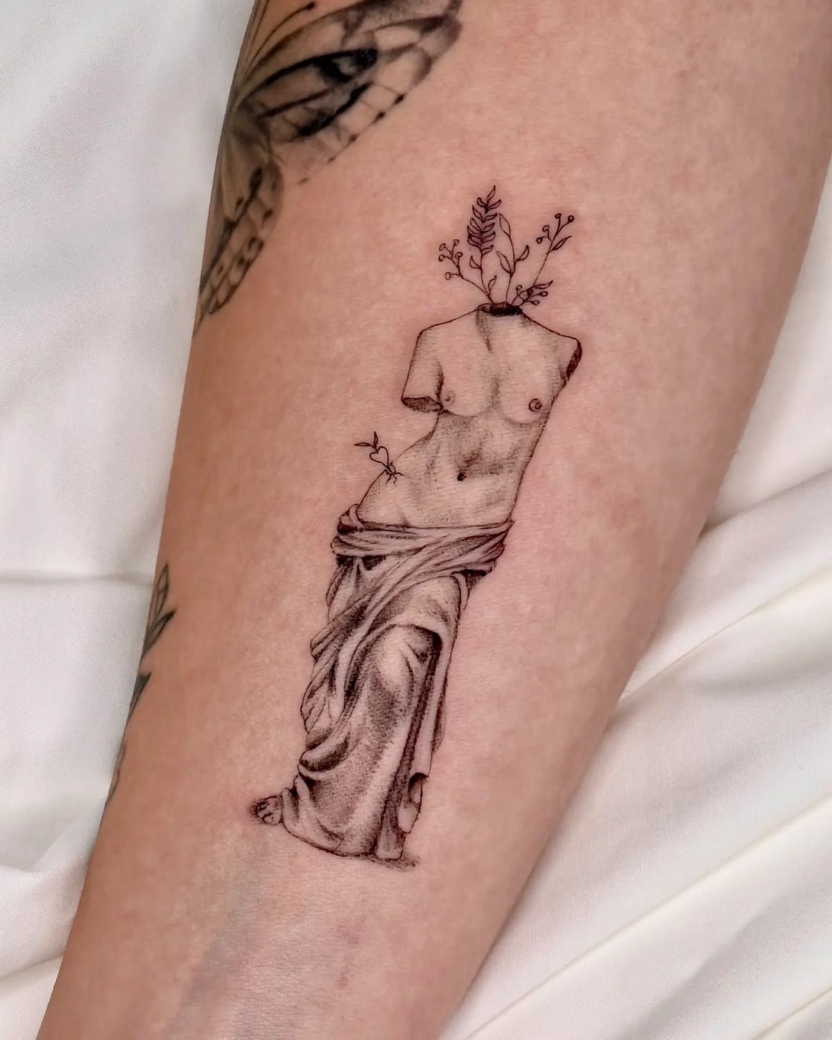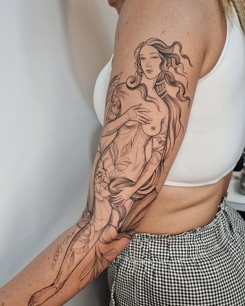 This tattoo feels like art and healing in the same breath. The torso statue reference gives it that iconic goddess silhouette, but the plants growing upward add a little rebirth moment—like beauty that keeps evolving. It’s quietly bold and honestly kind of poetic.