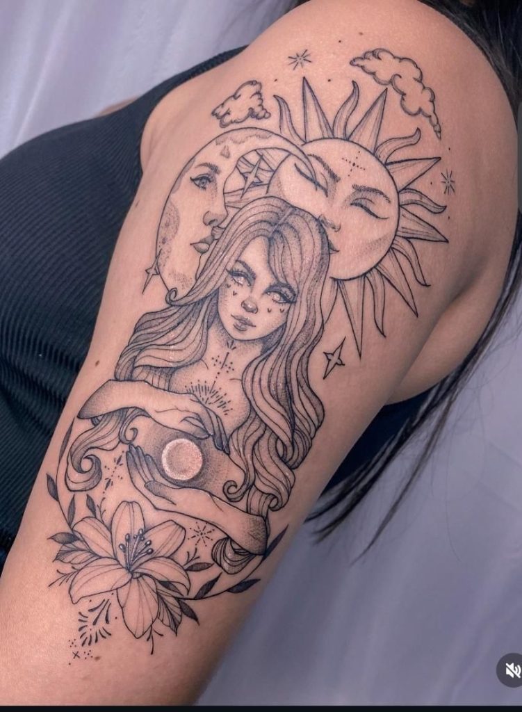 If you want a tattoo that feels mystical and a little cinematic, this is it: layered celestial faces (moon and sun) behind a wide-eyed girl holding a glowing orb, with stars, clouds, and a big lily anchoring the bottom. It has that “tarot card meets cosmic fairytale” energy that looks dramatic but still delicate thanks to the linework.