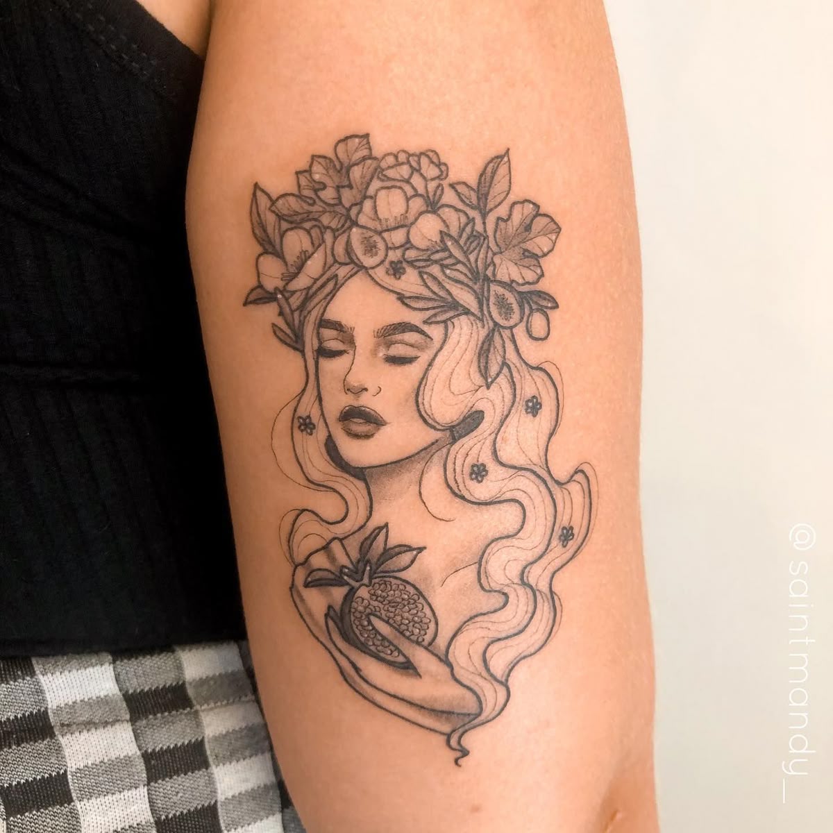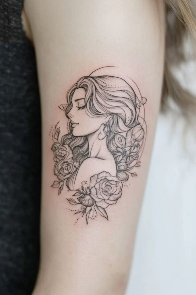 Technically, it’s all about clean line weight and gentle dotwork shading—perfect for an inner arm or upper arm placement where the curves of the body help the florals wrap naturally. If you love this vibe, ask your artist for crisp facial features, a slightly bolder outline on the profile, and lighter petals so the flowers don’t overpower the face over time.