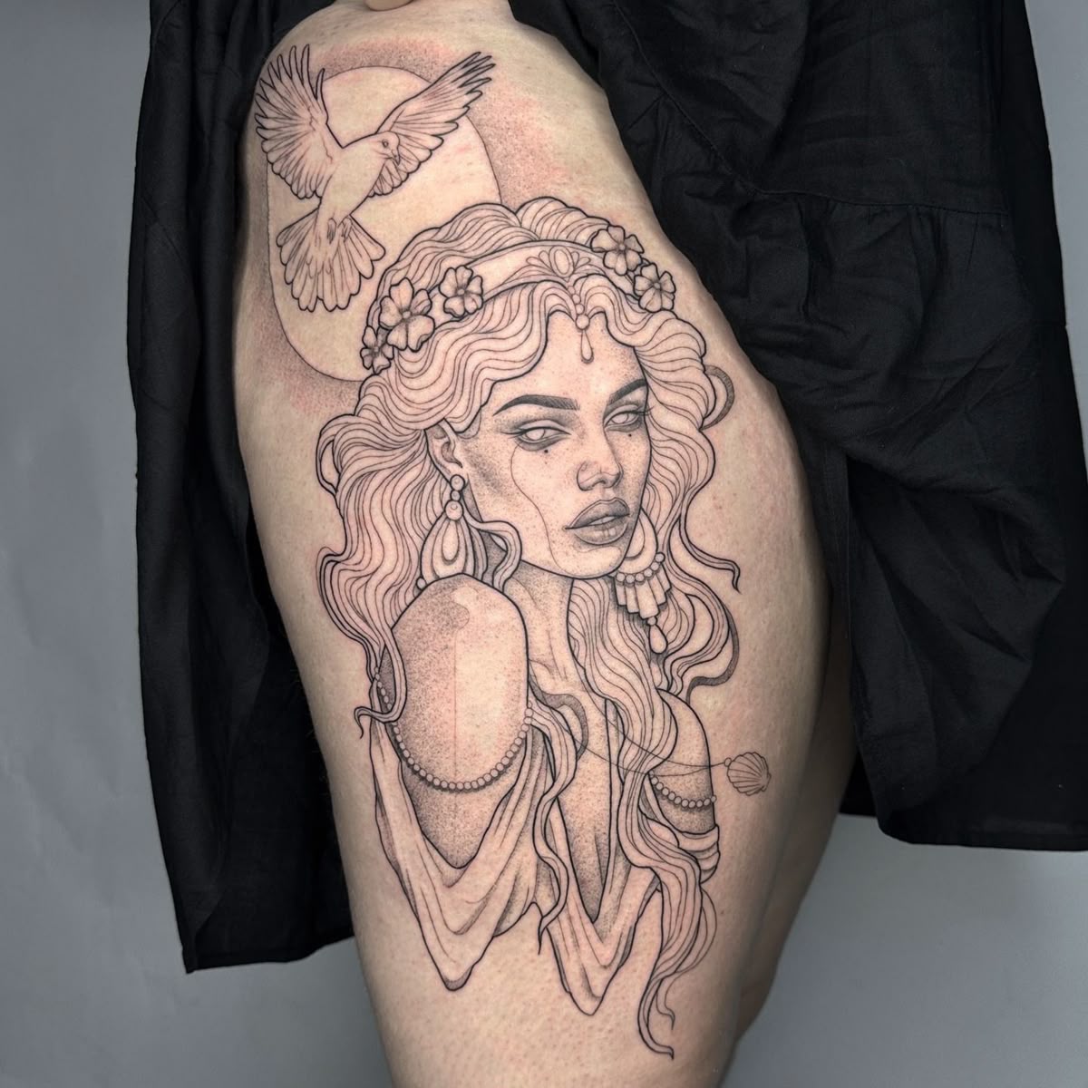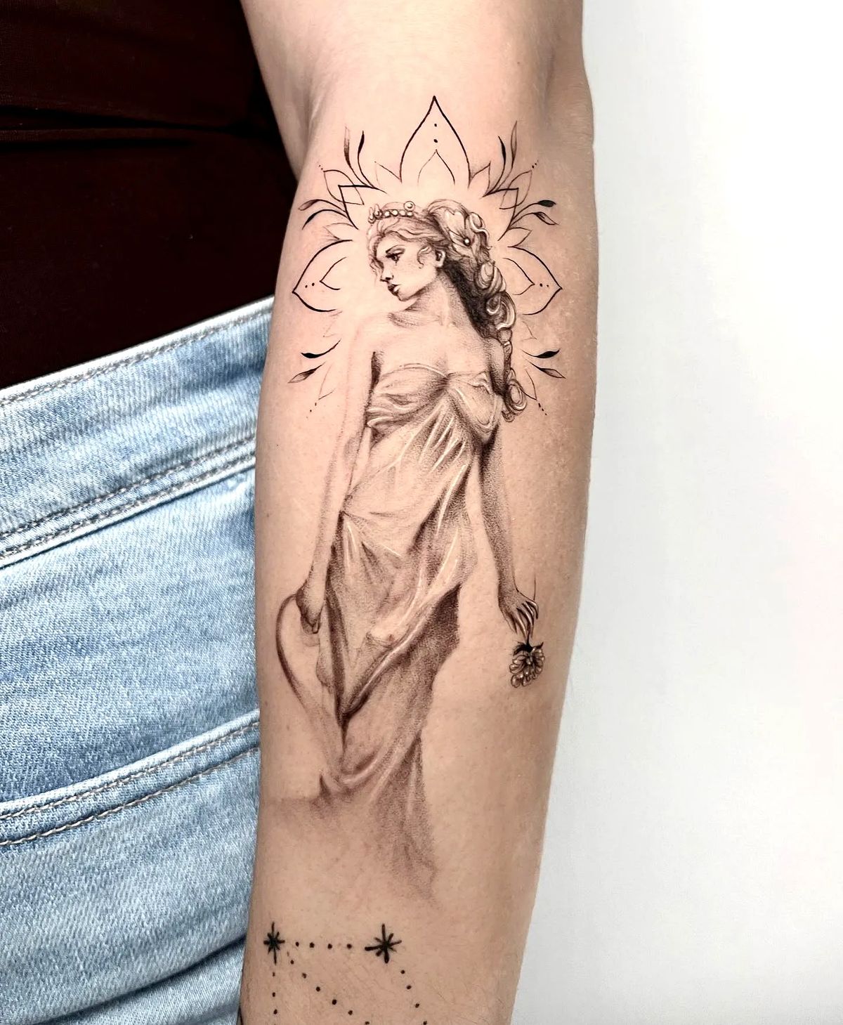 Compared to a full-figure goddess piece, this reads more modern and editorial—less narrative, more concept. It’s ideal if you want something that hints at goddesses’ mythology without needing faces, halos, or extra symbols. Keep the black shading soft and ask for smooth gradients in the drapery so it stays elegant. It’s also a clever way to go minimalist while still feeling like a real statement.