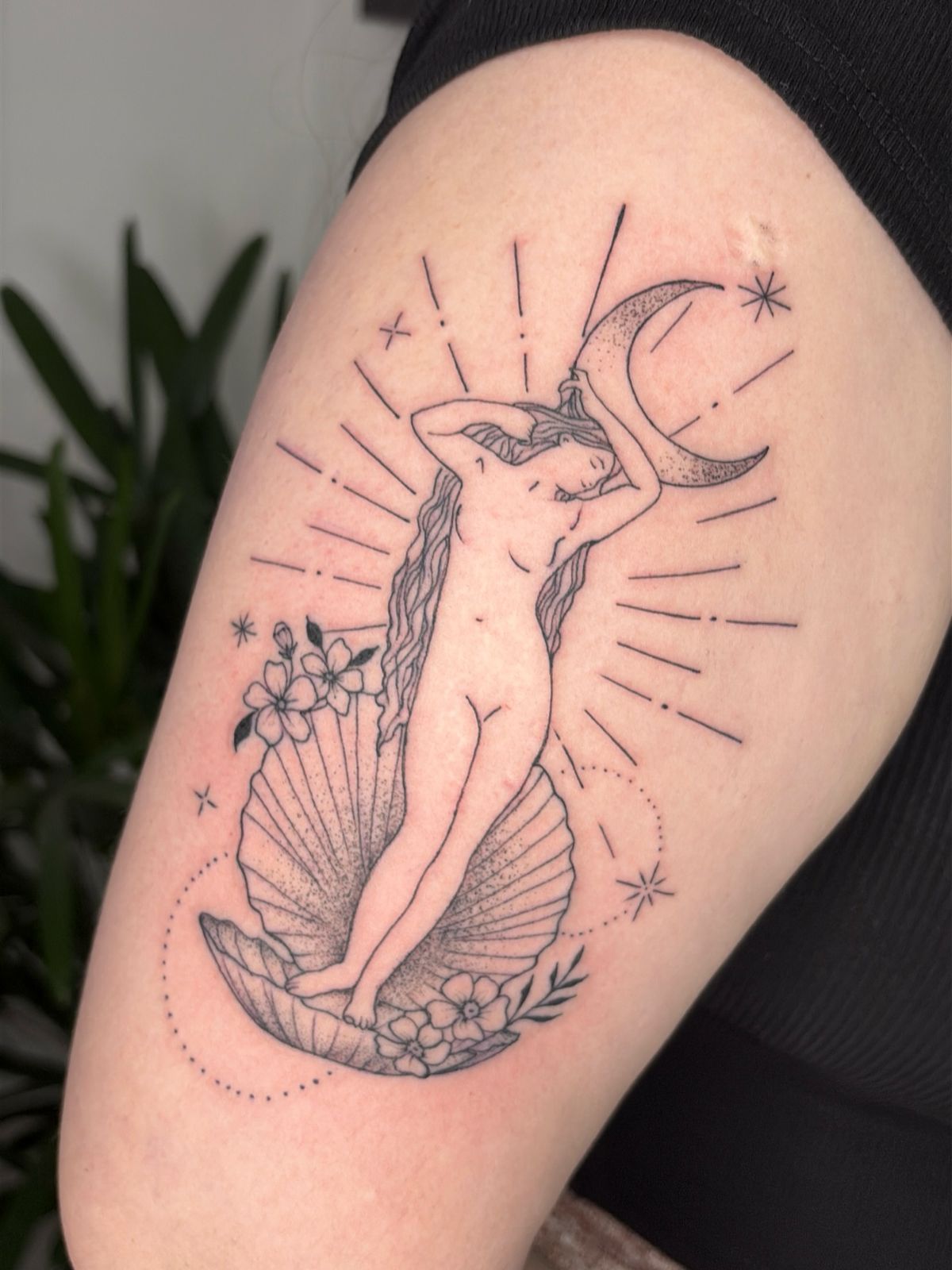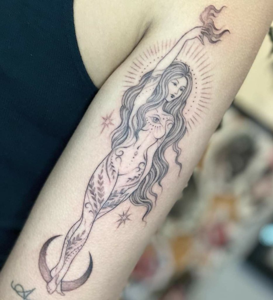 Trend-wise, this is right in that 2025 zone where a fine line meets clean black outlines and airy negative space. It’s perfect if you want something that looks curated, not crowded. Place it where the shell can sit naturally (upper arm, outer bicep, or thigh), and ask for gentle stipple shading so it stays soft. It’s a great symbol of Greek mythology goddesses’ options without needing a huge sleeve.