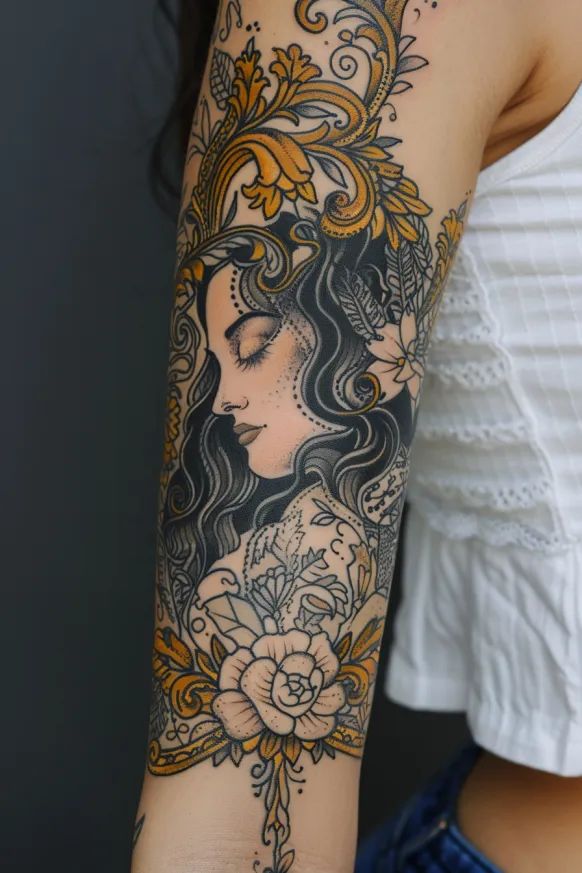 For styling: this leans into design realism, so pick an artist who’s strong with smooth gradients and subtle contrast. Keep aftercare extra consistent (hydration + sun protection) because realism fades faster than bold outlines. If you want it to stay crisp, ask for slightly deeper shadows in the hair and folds—those tiny decisions help the realism age beautifully.