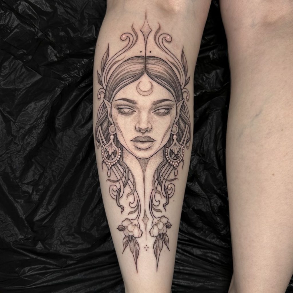 25. Lunar Elf Queen Calf Tattoo