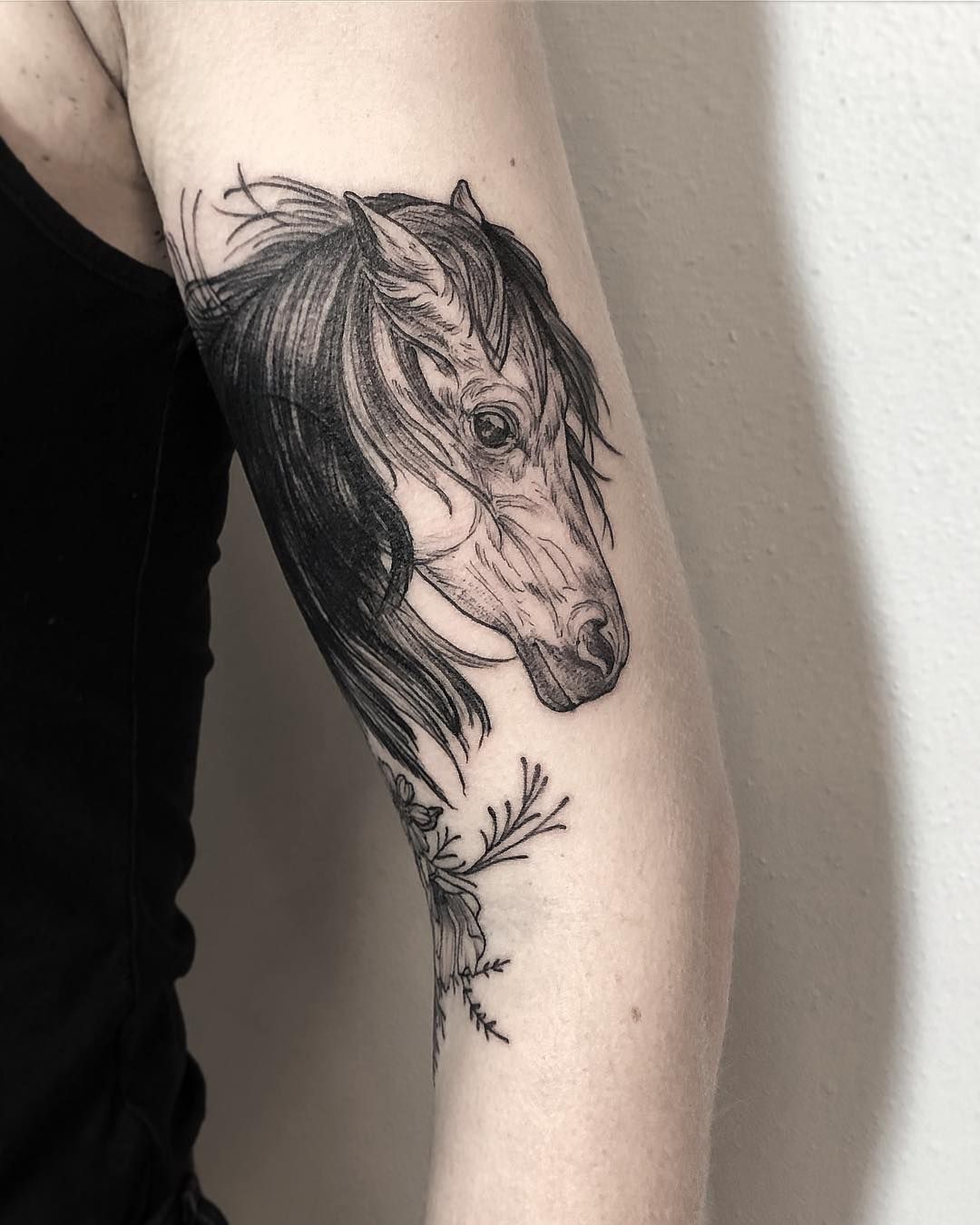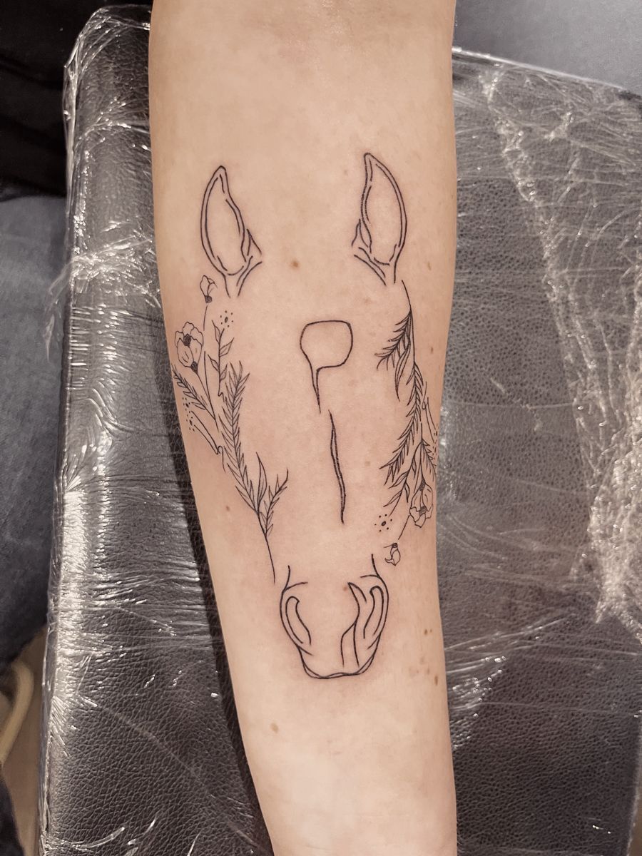 Sometimes, the least detailed tattoos are the most striking. With a simple line design, this creates the outline of a horse head with delicate floral touches. It feels airy and minimal; its charming, sketch-like quality allows it to feel light and effortless.