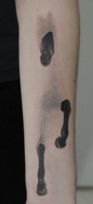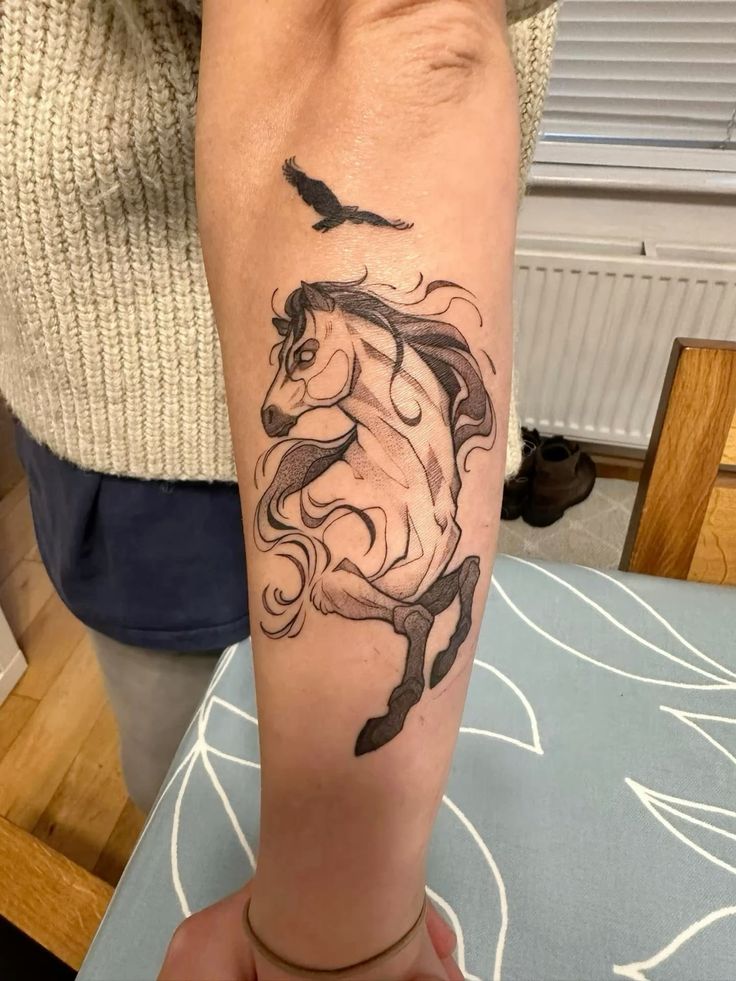 This tattoo makes a creative split from the mainstream with a minimalist dotted technique that highlights horses’ hooves. It comes across as abstract yet immediately recognisable, lending it a quirky and modern spirit. It feels more like a piece of artistry, thus ideal for someone who desires an unusual ink.