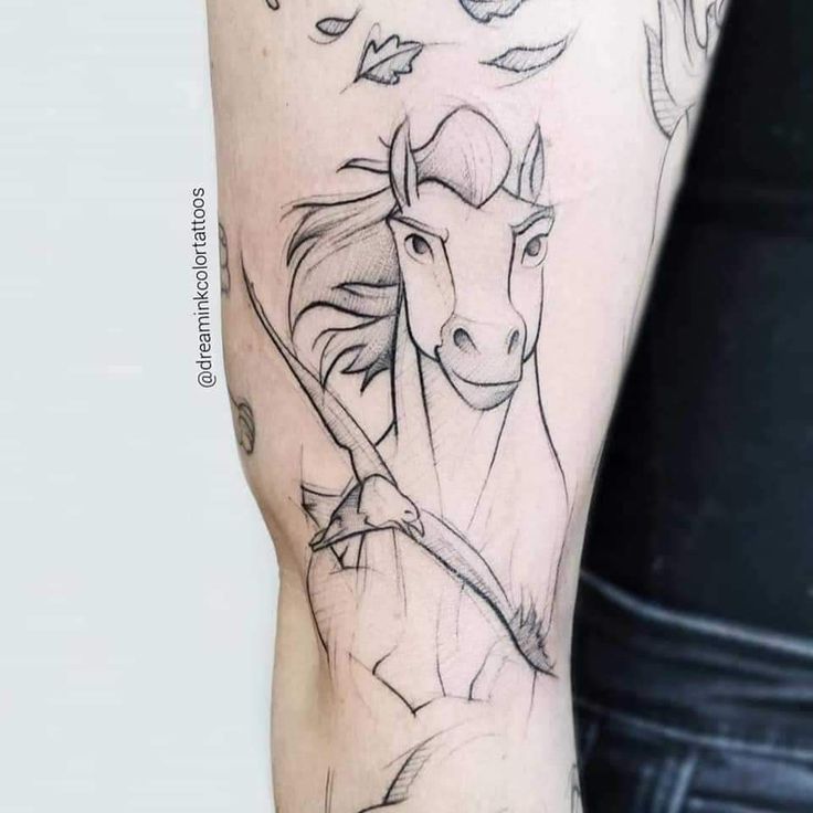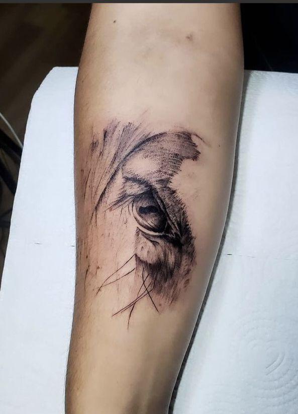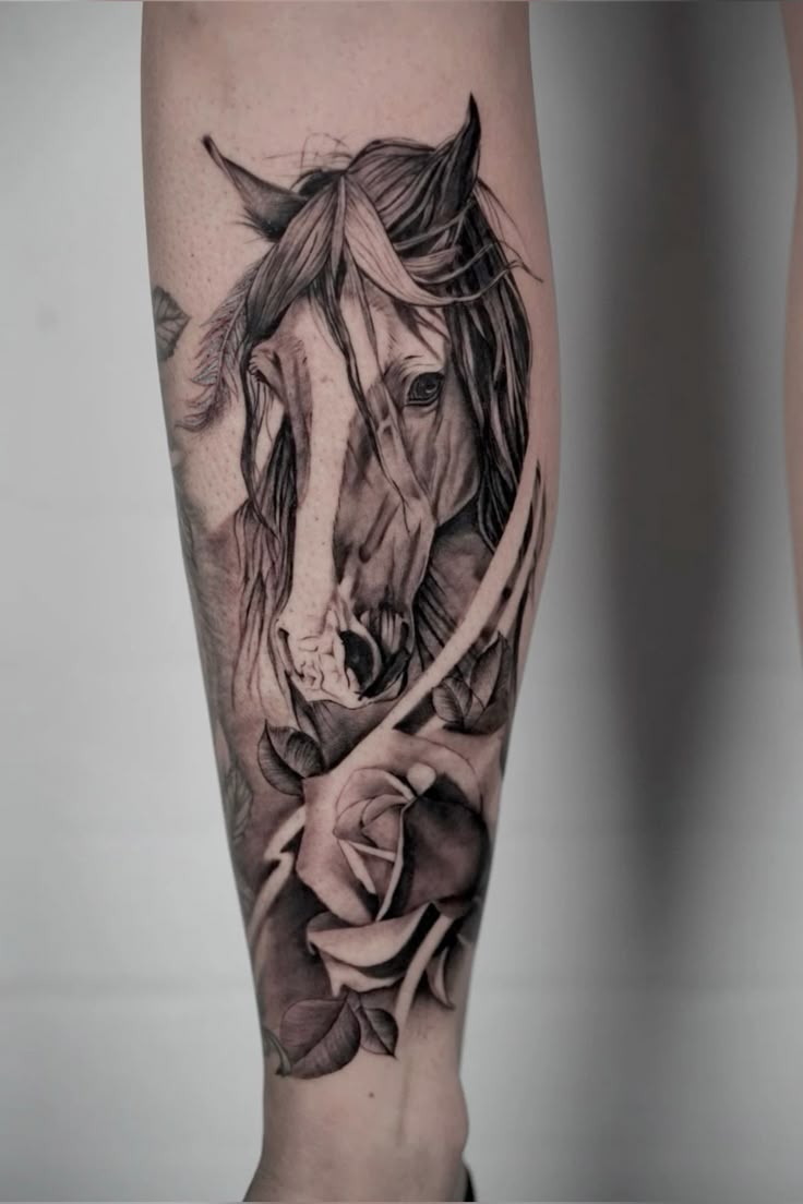 This tattoo feels tender and almost dreamlike, with soft shading giving the horse a gentle presence. The eyes are expressive, pulling you in with a quiet strength that feels both comforting and inspiring. It’s less about dramatic details and more about capturing emotion in a subtle, artistic way.