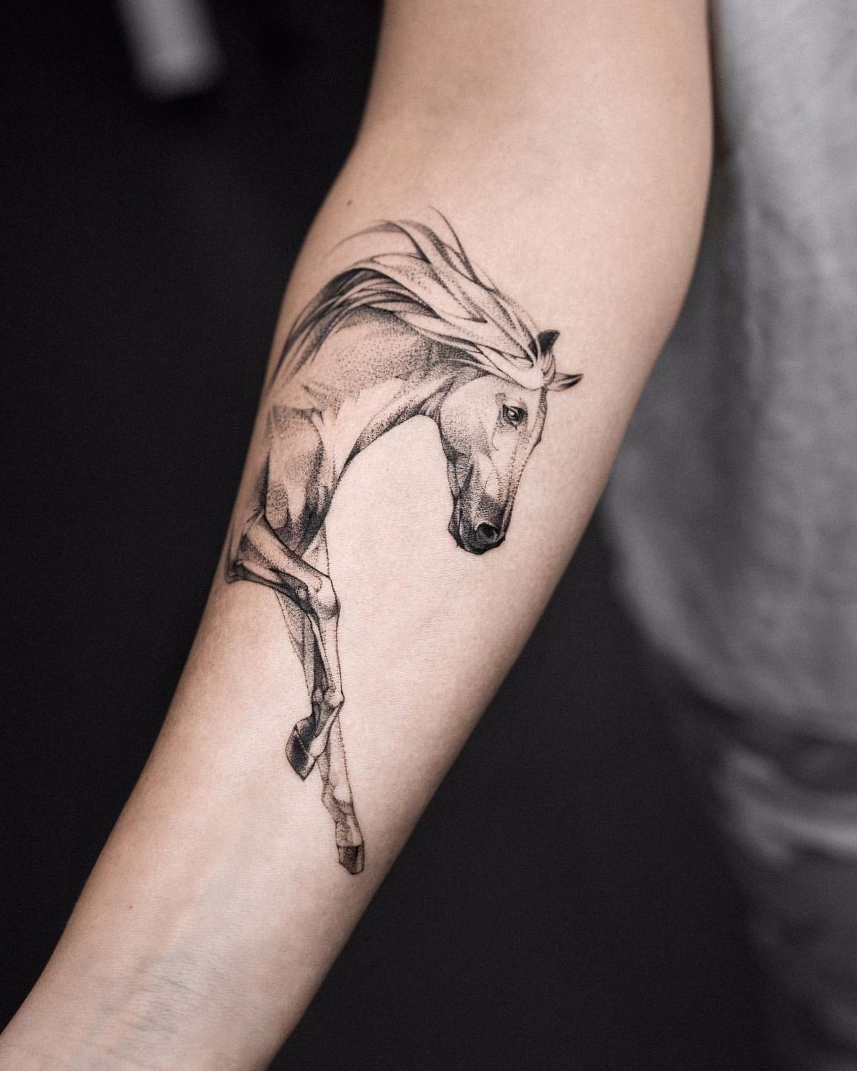 Forearm tattoos for females are ideal because the length of this horse complements the natural line of the arm. If you like tattoo designs that are sleek, contemporary, and somehow carry a notion of momentum, this would be a design worth considering.