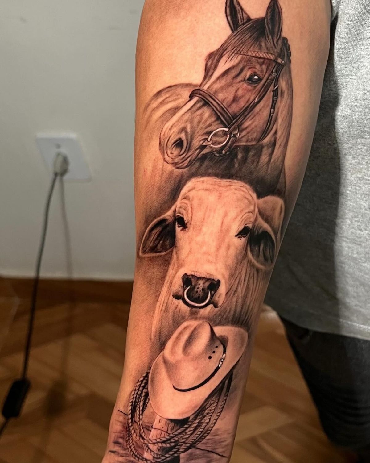 This tattoo goes all full Western with a very detailed horse, cow, and cowboy hat. It stands for life in the ranch, tradition, and the rugged life in celebration of loyalty, hard work, and the open range. Shading is heavy and rich in contrast, very almost the black-and-white snapshot of heritage brandished to the skin.