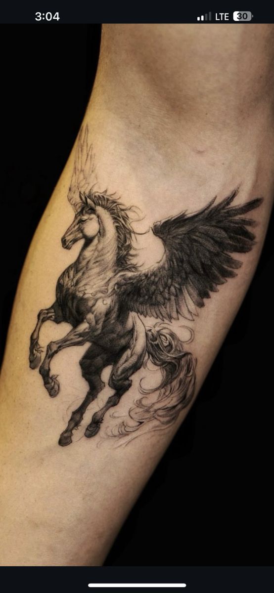Wings added to the horse give it a Pegasus, the myths of freedom and the imagination. The sight of this tattoo feels majestic, the feathers detailed, and the pose dynamic enough to give it an impression ready for flight. It’s bold, powerful, and energizes a fantasy world.