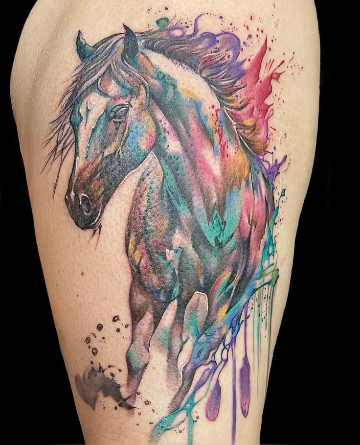 This example bursts with hues of color that blend smoothly into blues, purples, and pinks that offer a somewhat dreamy watercolor feel. It looks as if the horse might step down from the painting, with those splashes of colors being very much an expression of art and emotion. It stands for boldness, creativity, and absolute neglect.