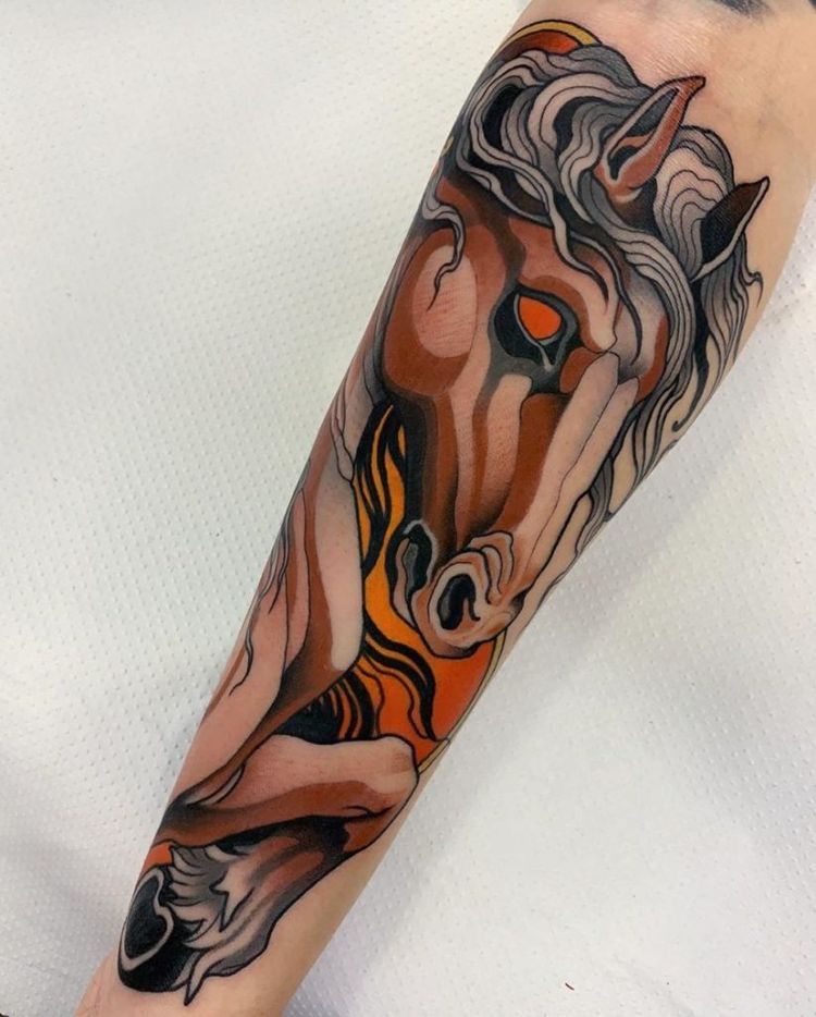 This horse-tattoo is bursting with colors; thus, one can almost feel it coming to life. With these bold outlines and bright shades of orange, the tattoo exudes energy, passion, and raw strength. The dramatic styling is contemporary, yet inspired by American traditional arts, which lend it a timeless edge with a bold twist.
