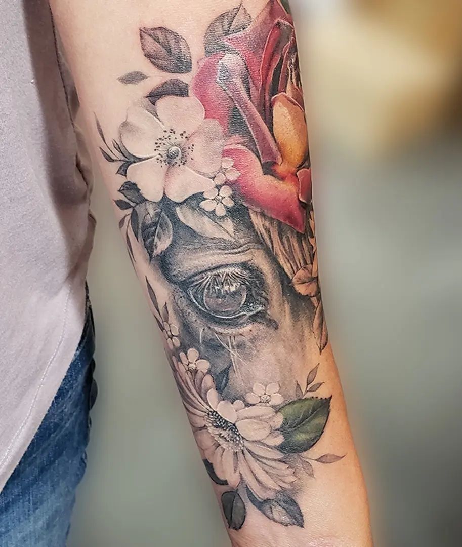 Zooming in on the horse’s eye surrounded by vivid flowers, this tattoo feels incredibly emotional. It blends beauty with sensitivity, making it a piece that’s as much about feeling as it is about looks. The flowers soften the intensity of the gaze, giving it a romantic and almost healing energy.