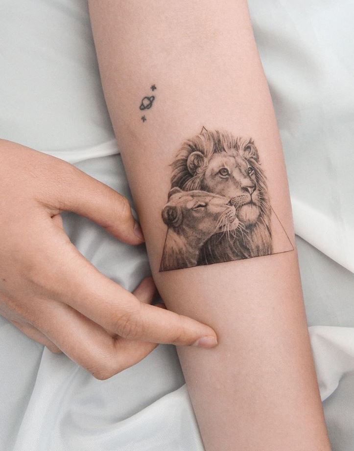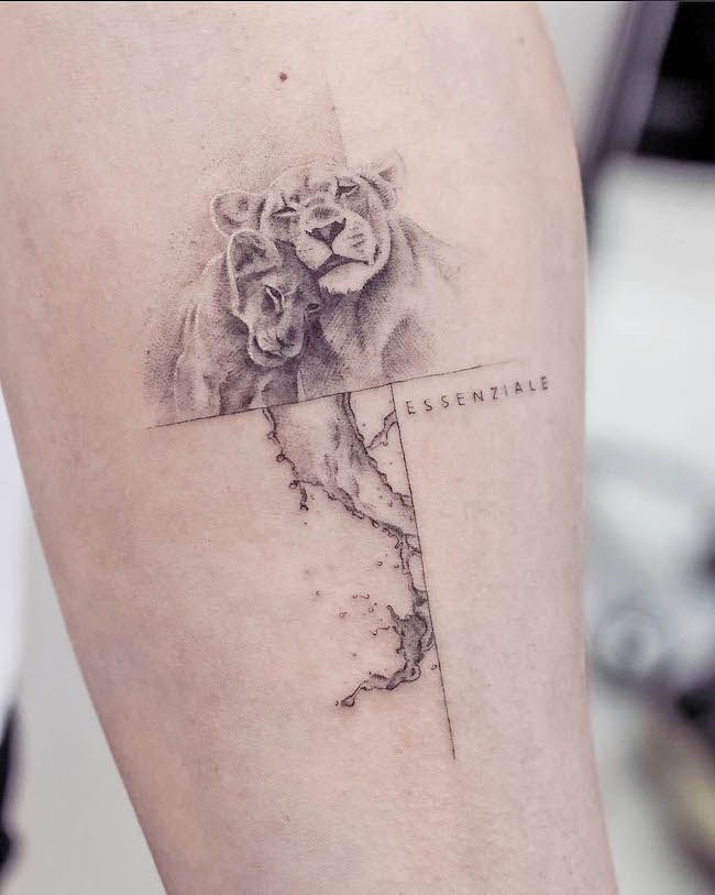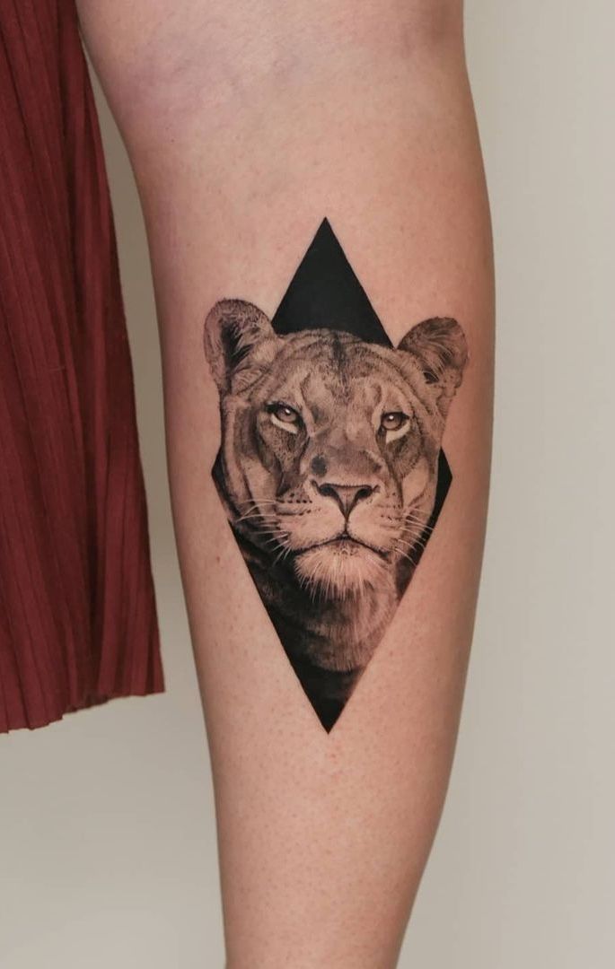 This quiet, intimate forearm scene feels like a promise—two rulers of the savannah sharing one gaze, one heartbeat. The soft shading reads tender rather than fierce, so the whole composition whispers feminine power instead of shouting it. Framed by a clean triangular window, it’s a design for women who love subtle storytelling: loyalty, steadiness, and that calm I’ve-got-this confidence. If you’ve been waiting for a lioness tattoo that balances grace with presence, this is your moment—simple, elegant, and unmistakably about women’s strength. For placement and styling, a forearm suits everyday visibility and pairs beautifully with bracelets or a minimalist watch. Choose Fine line detailing and soft grey wash to keep it wearable for women at work or on the weekend.