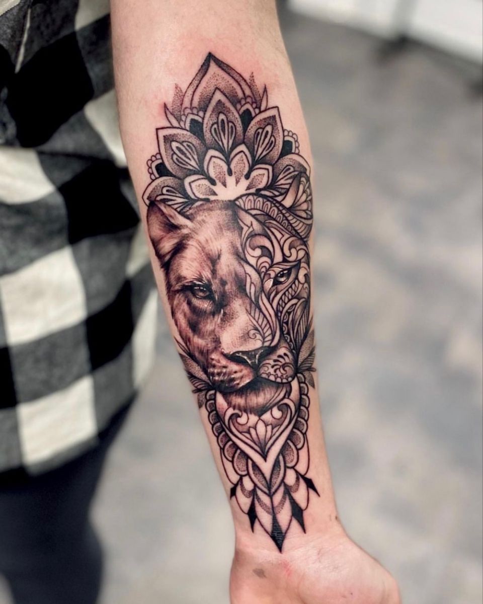 Half spiritual, half street-style, this lioness wears an ornate mandala like a crown. The mix of filigree and portraiture gives you that roaring-on-the-inside glow without a literal roar. It’s powerful, feminine, and a gorgeous design for women who love pattern play and symmetry. Emotional payoff: you’ll feel armored but elegant—think women’s strength; you can roll up your sleeves and show it when negotiations get spicy. The mandala’s symmetry calms the eye, while the portrait adds heart. If a full arm sleeve feels like too much, this forearm format still carries ceremony without the time commitment.