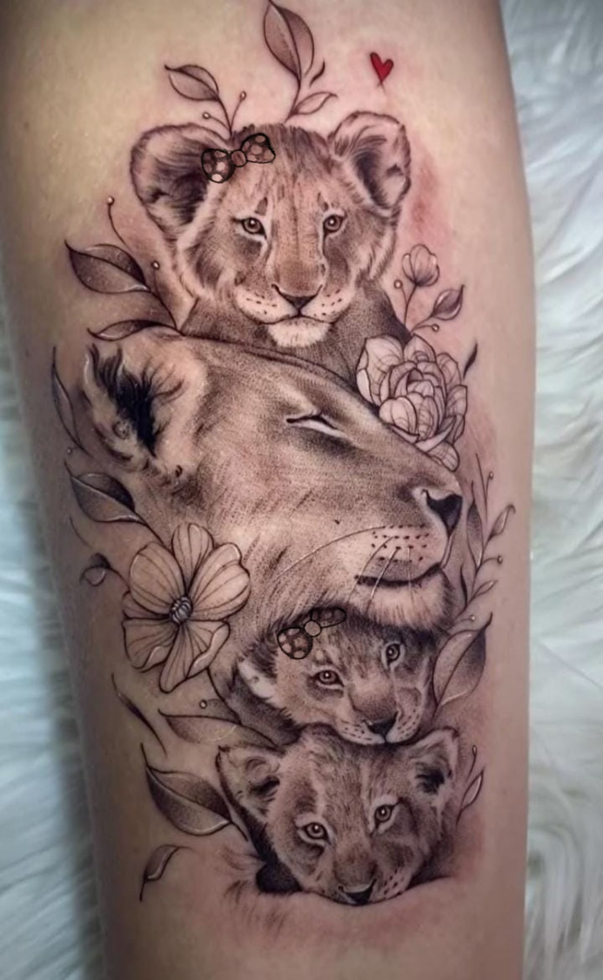 Stacked like a warm family photo, this composition wraps Mom and three little faces in soft leaves and petal details. The flow is vertical yet cushioned, making it feel like a hug you can wear. It’s a design for women celebrating lineage, chosen family, or simply the instinct to protect. Comparison with other cuts: if a half-lion, half-woman concept feels too edgy, this reads more tender while staying artful. Fineline stippling adds a textile softness compared with heavy fill, and the subtle heart detail threads sentiment without tipping sweet. Works on the calf or a woman’s leg when you want length.