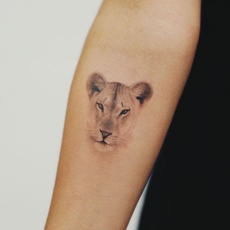 21. Soft-Gaze Micro Lioness on Inner Forearm